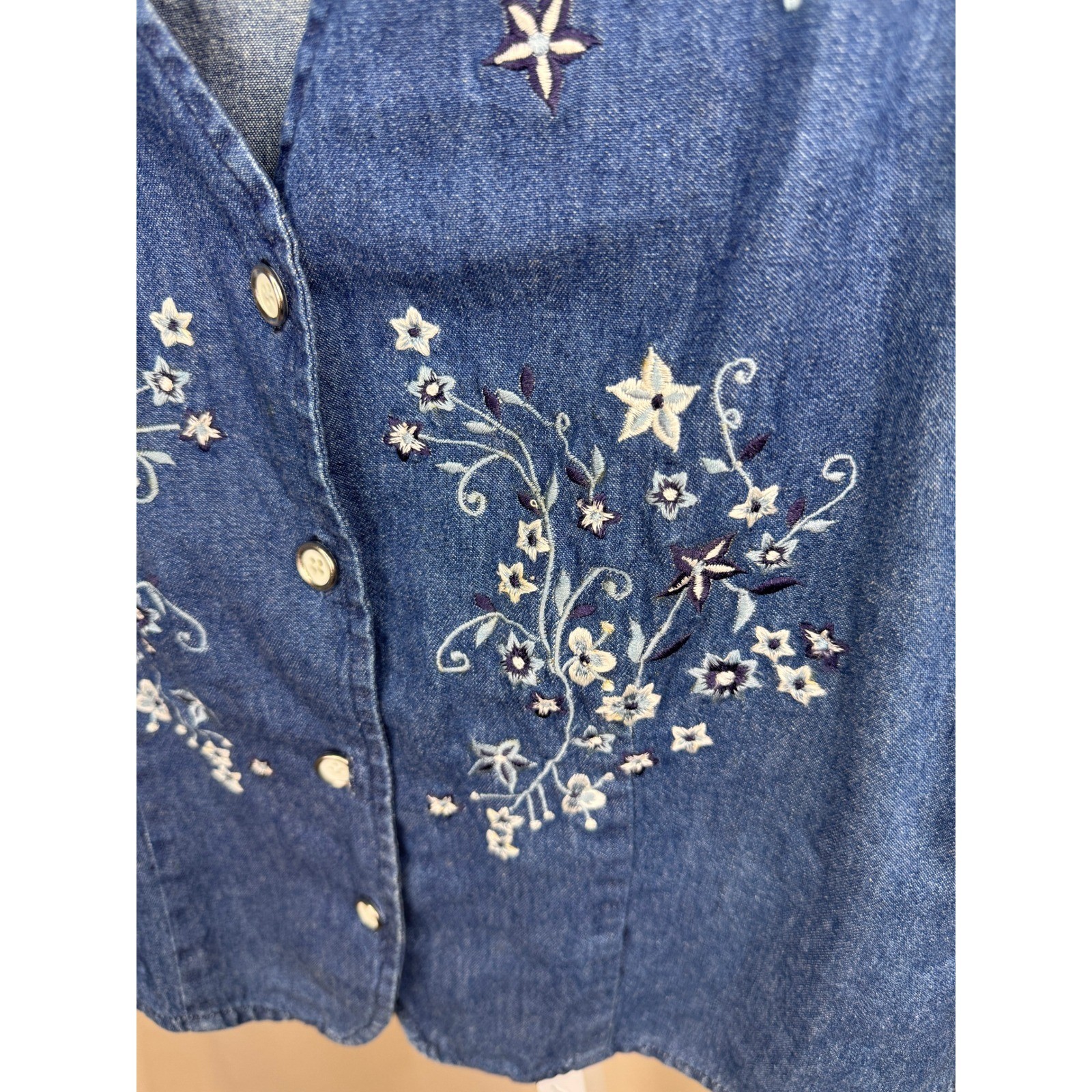 как выглядит Vintage 90s Orvis Denim Embroidered Floral Vest Women