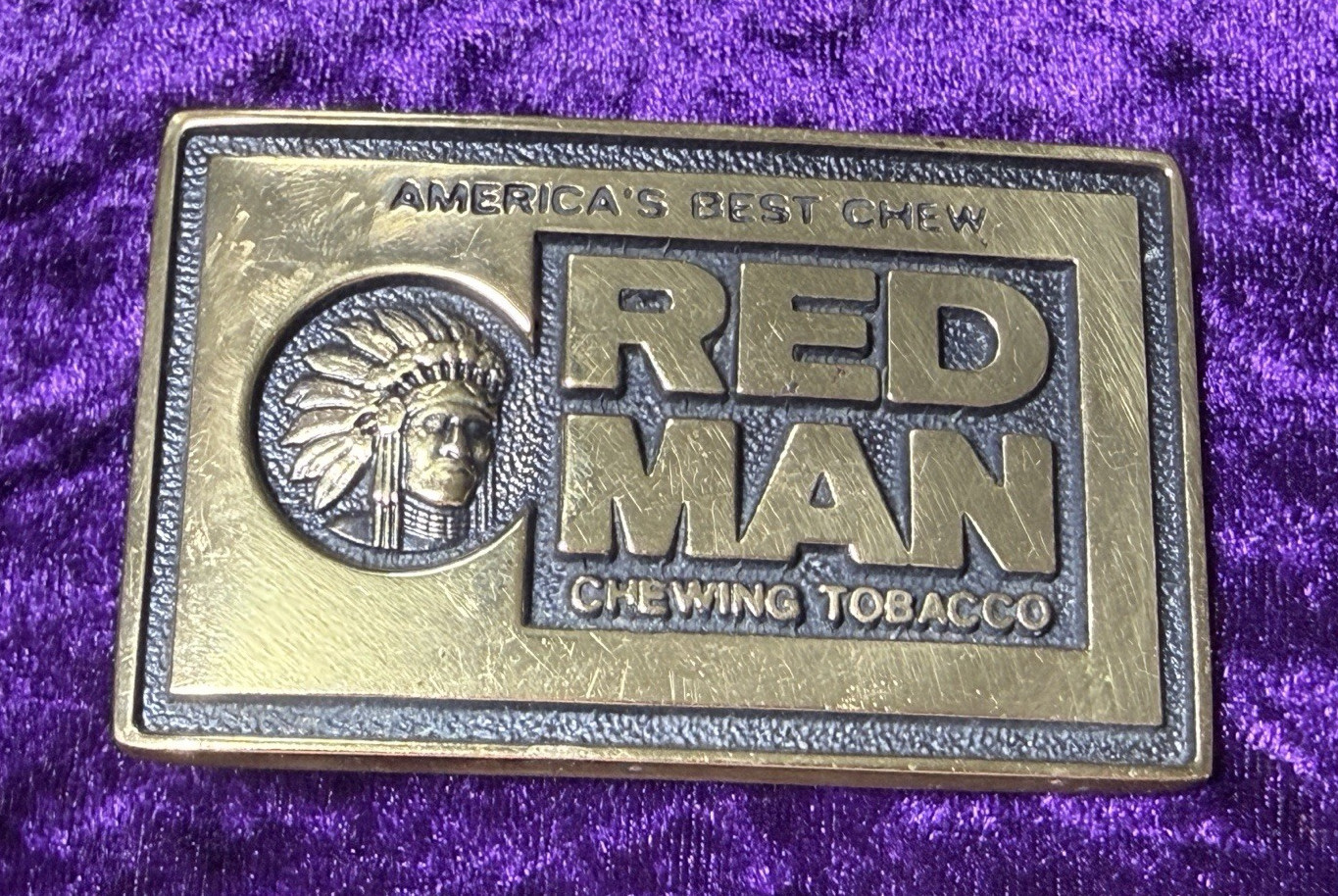 Vtg Red Man Belt Buckle 1981 Chewing Tobacco Solid Brass USA Western Cowboy