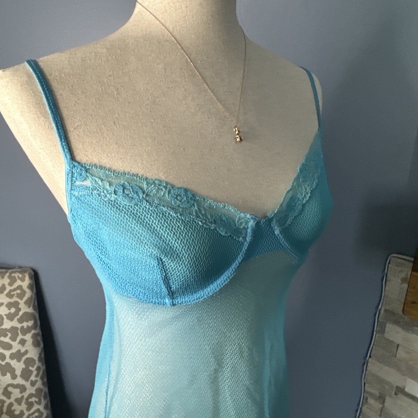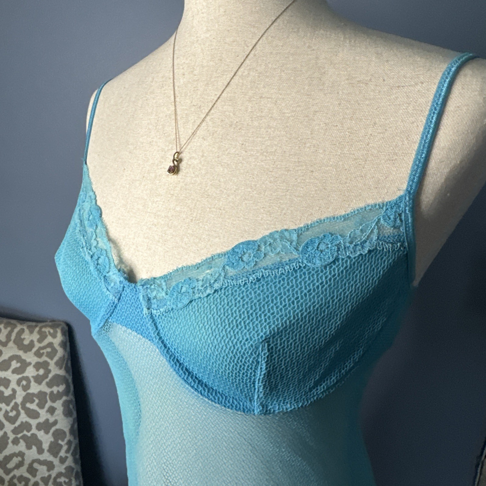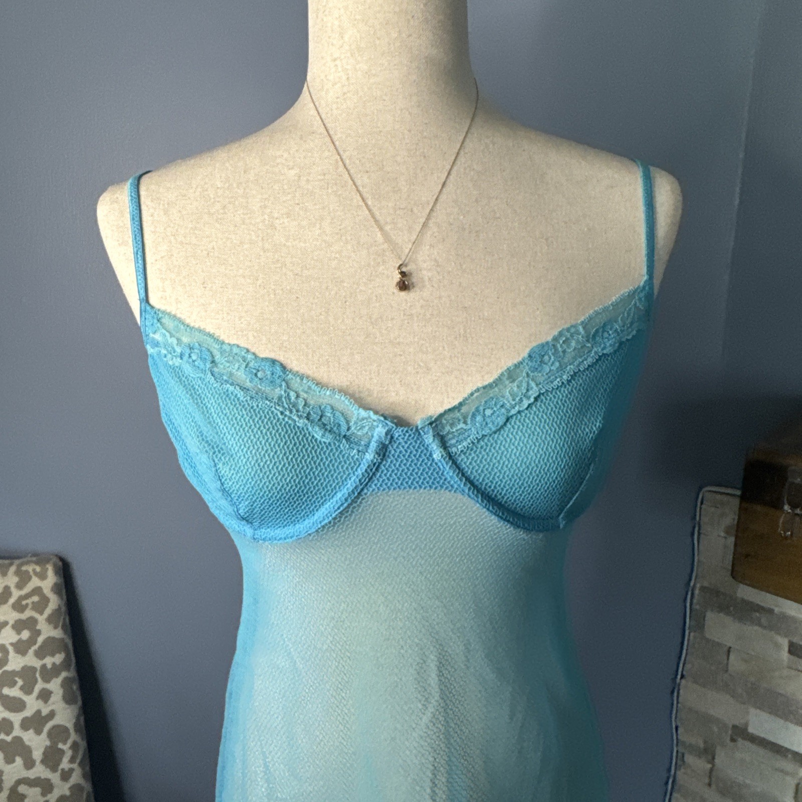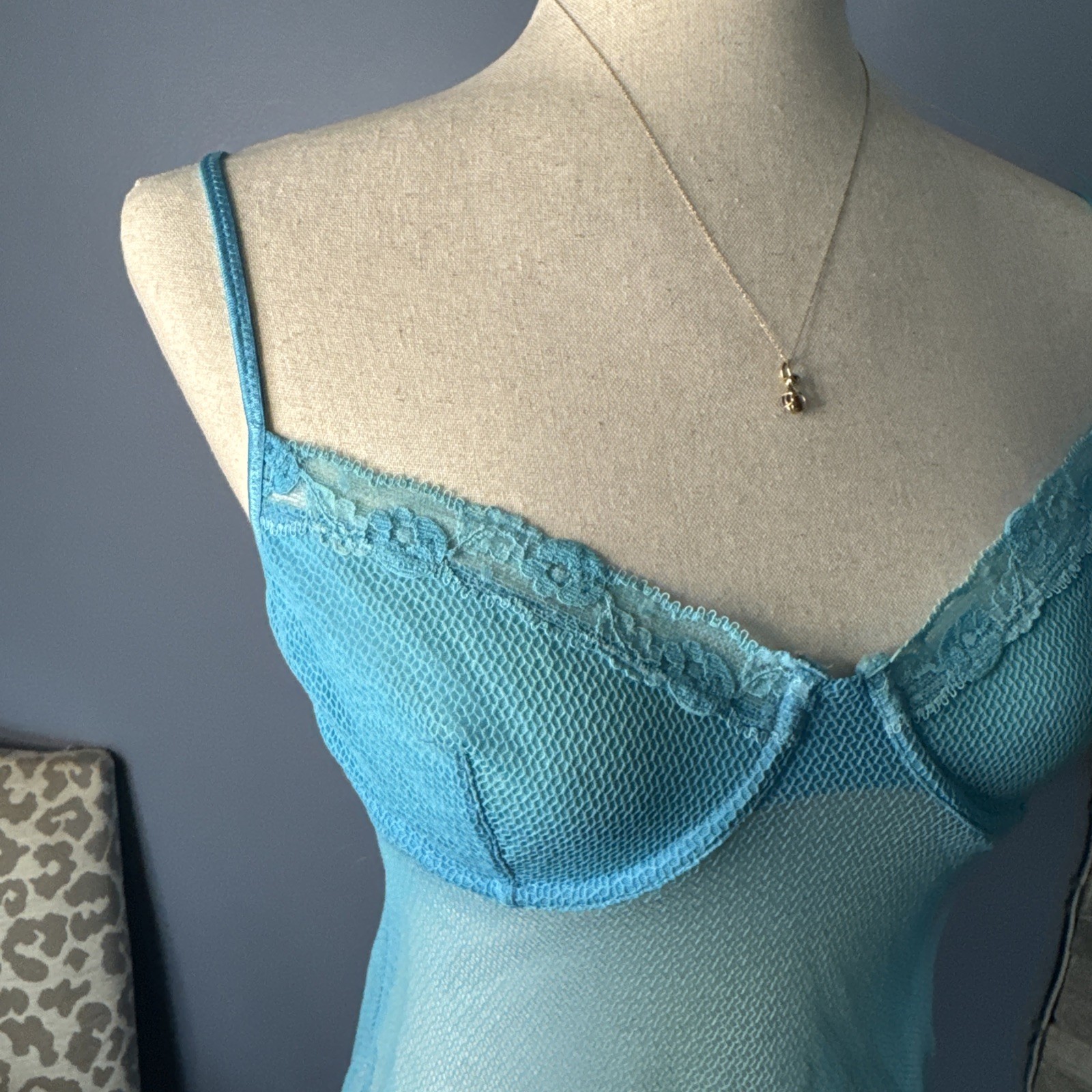 Vintage Victoria s Secret 36C Sheer Mesh Chemise Babydoll Slip Y2K Blue
