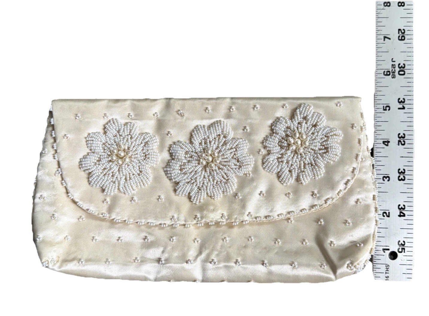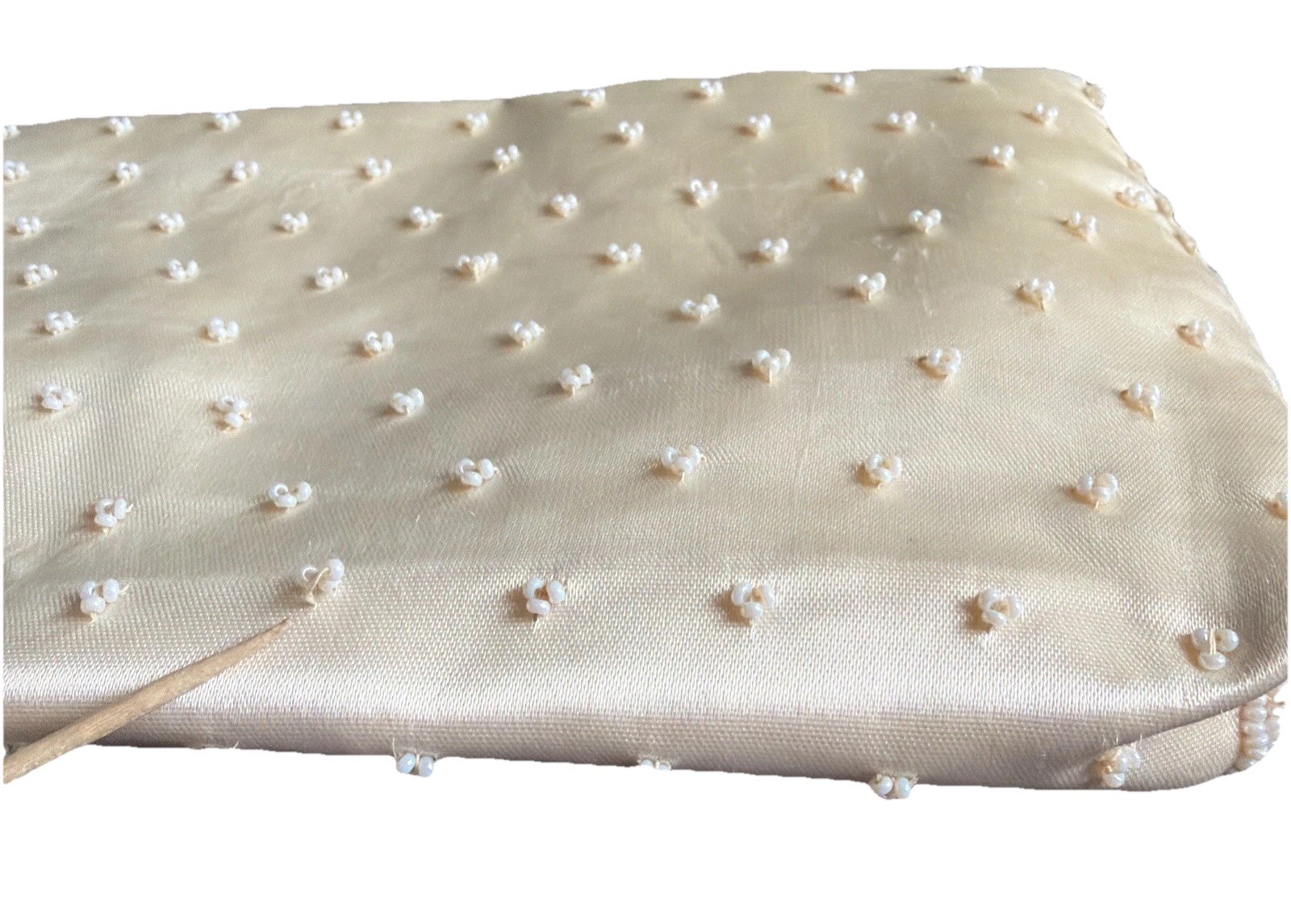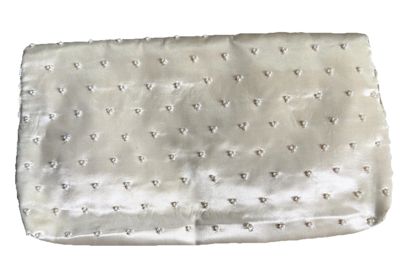 как выглядит Vintage Micro White Seed Bead Satin Clutch Handbag Hand Made in Hong Kong фото