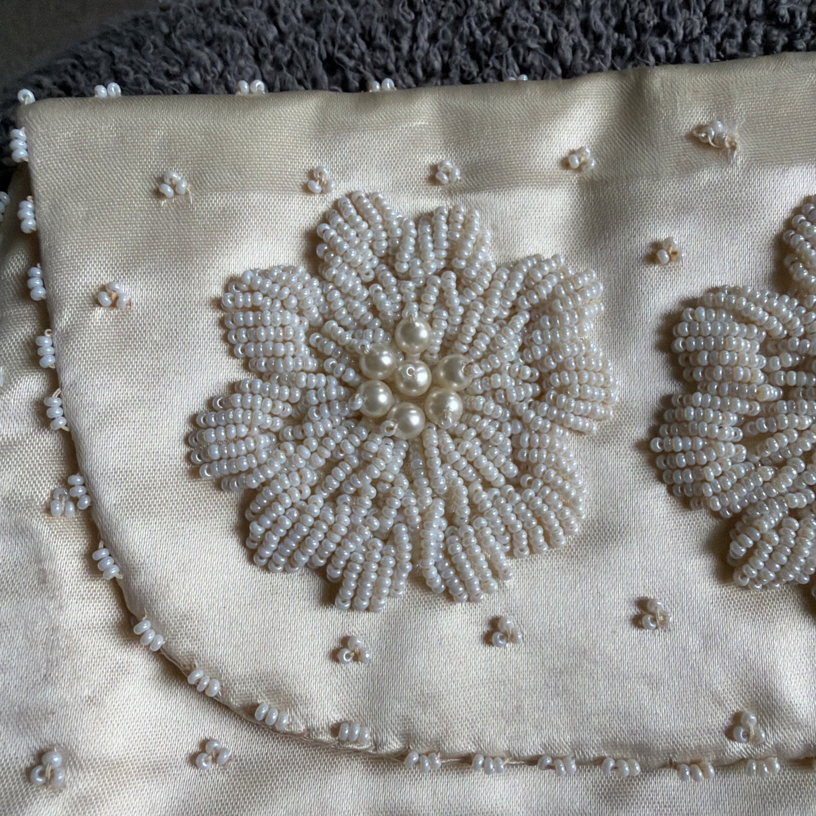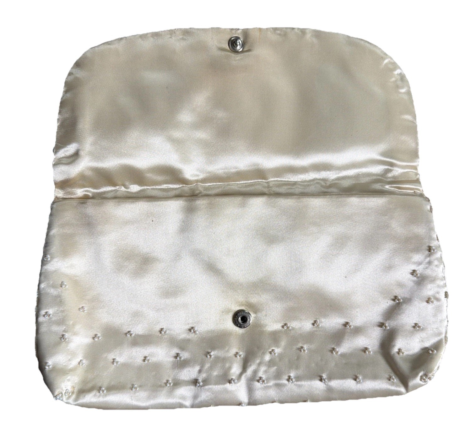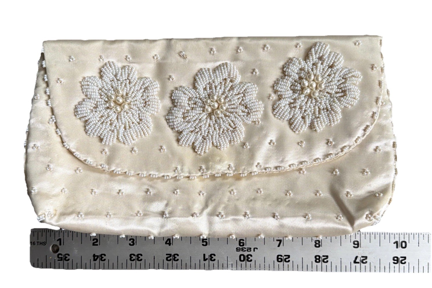 как выглядит Vintage Micro White Seed Bead Satin Clutch Handbag Hand Made in Hong Kong фото