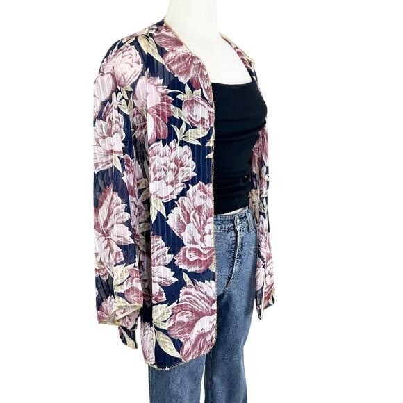 Vintage Open Front Floral Cardigan Top Sheer Gold Trim XS/S Kimono