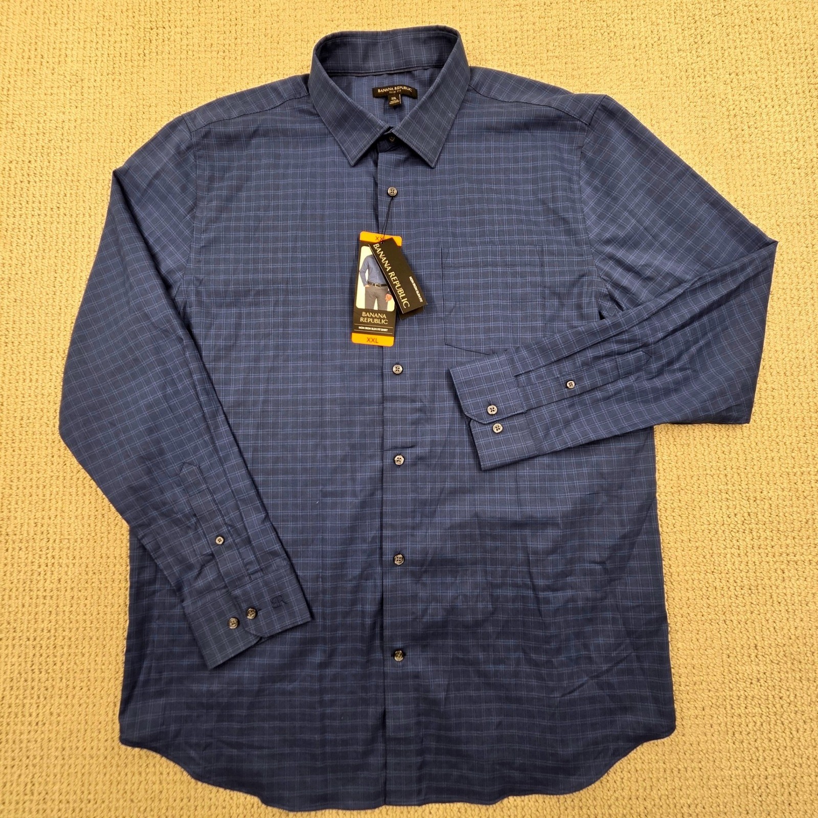 NWT Banana Republic Non Iron Slim Fit Shirt Dark Blue Plaid 100 Cotton Mens XXL