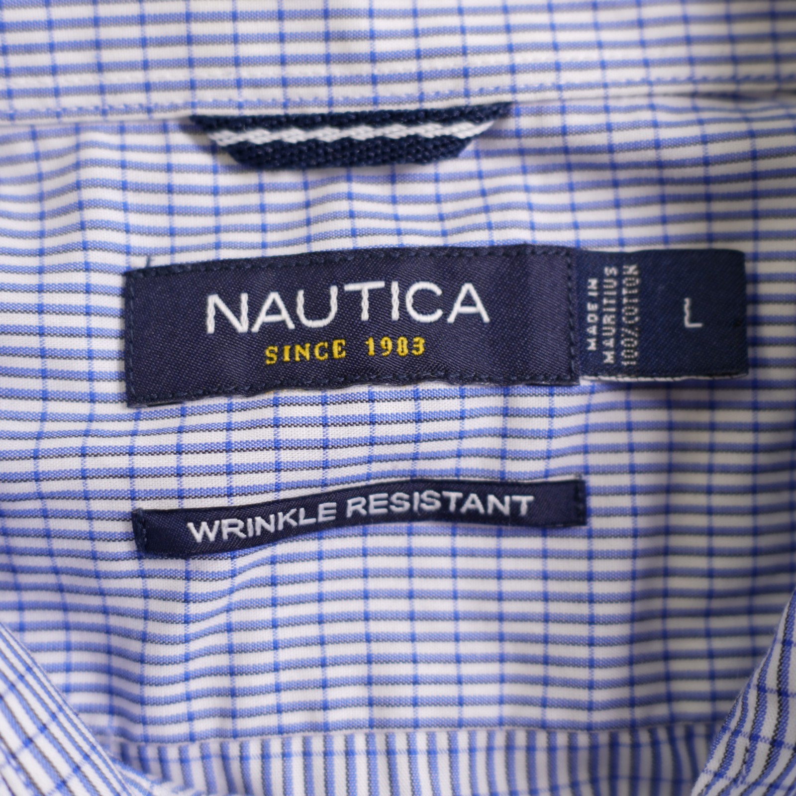 Nautica Men's Wrinkle Resistant Blue Check Collared Dress Shirt Large Cotton