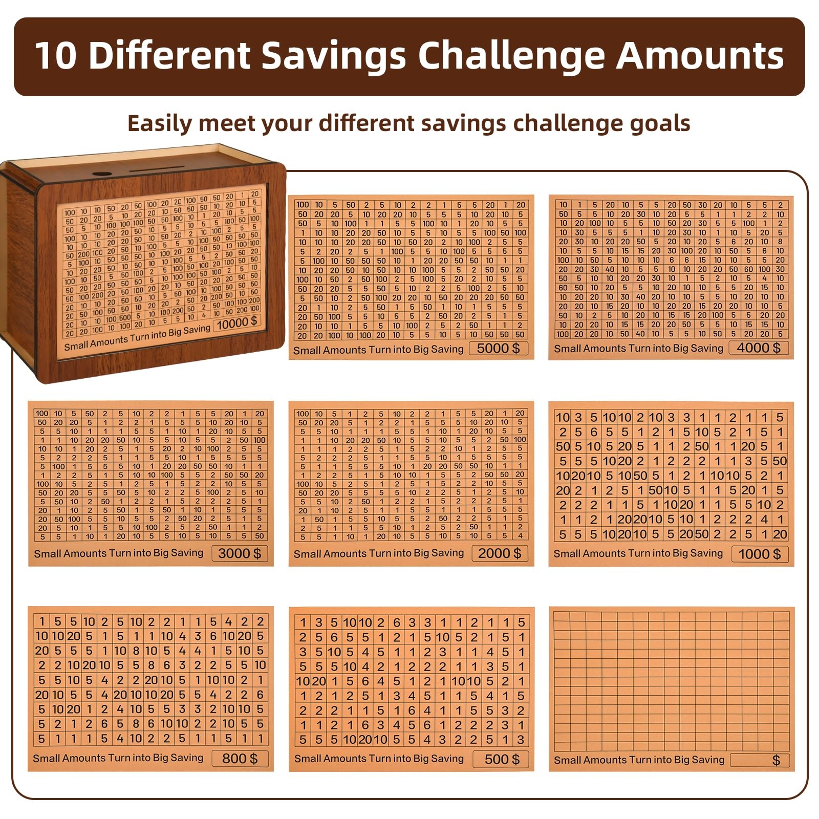 • Wooden Money Saving Challenge Box Cash Vault Piggy Bank for Savings Goals