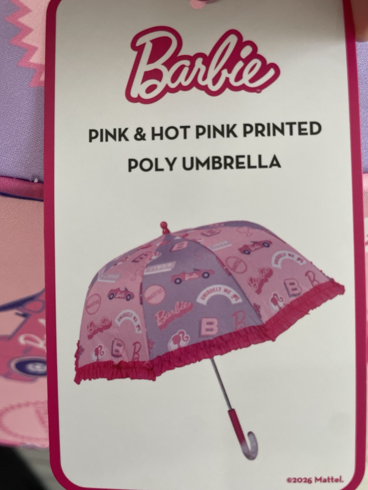 NEW Mattel Barbie Pink Hot Pink Printed Poly Girls Size Umbrella w/ Ruffles