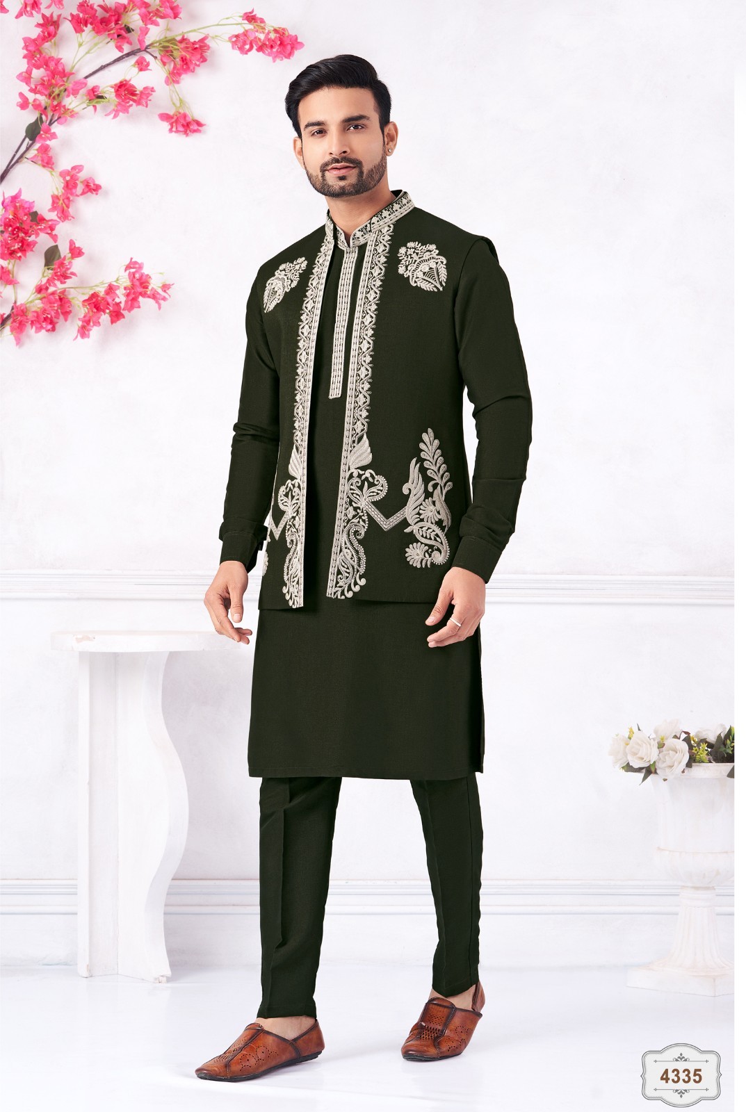 3 Pc Indian Mens Designer Embroidered Traditional Wear Kurta Payjama Jacket Set