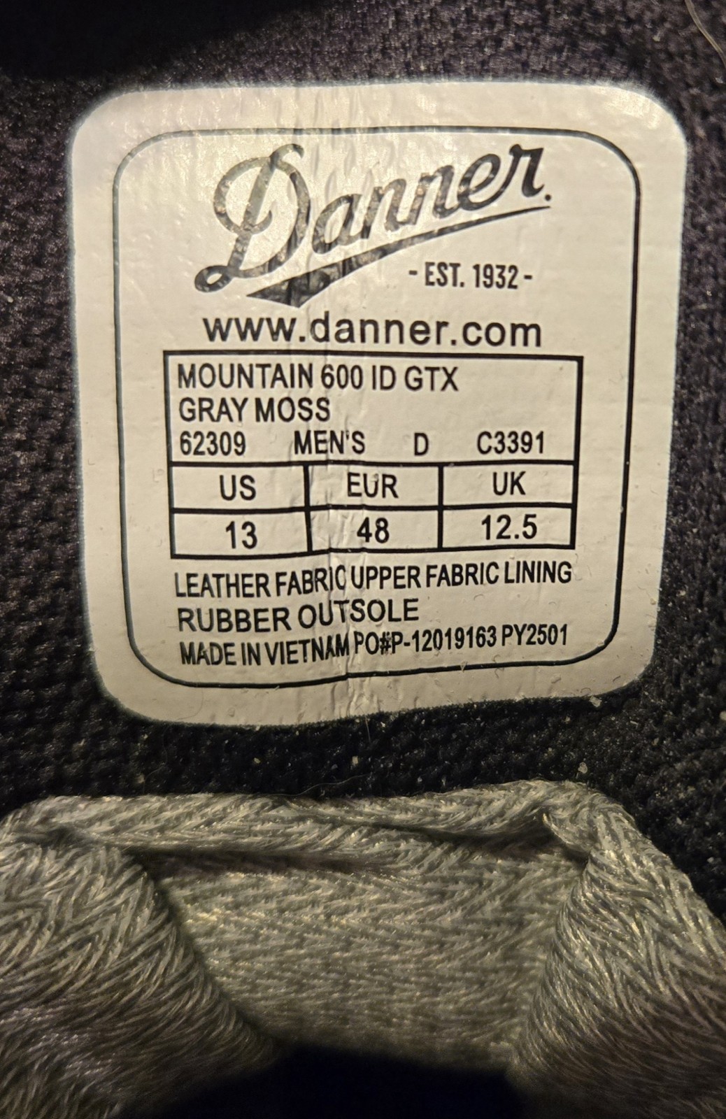 DANNER MENS 12.5 D MOUNTAIN 600 GTX ID HIKING SHOE BOOT GRAY