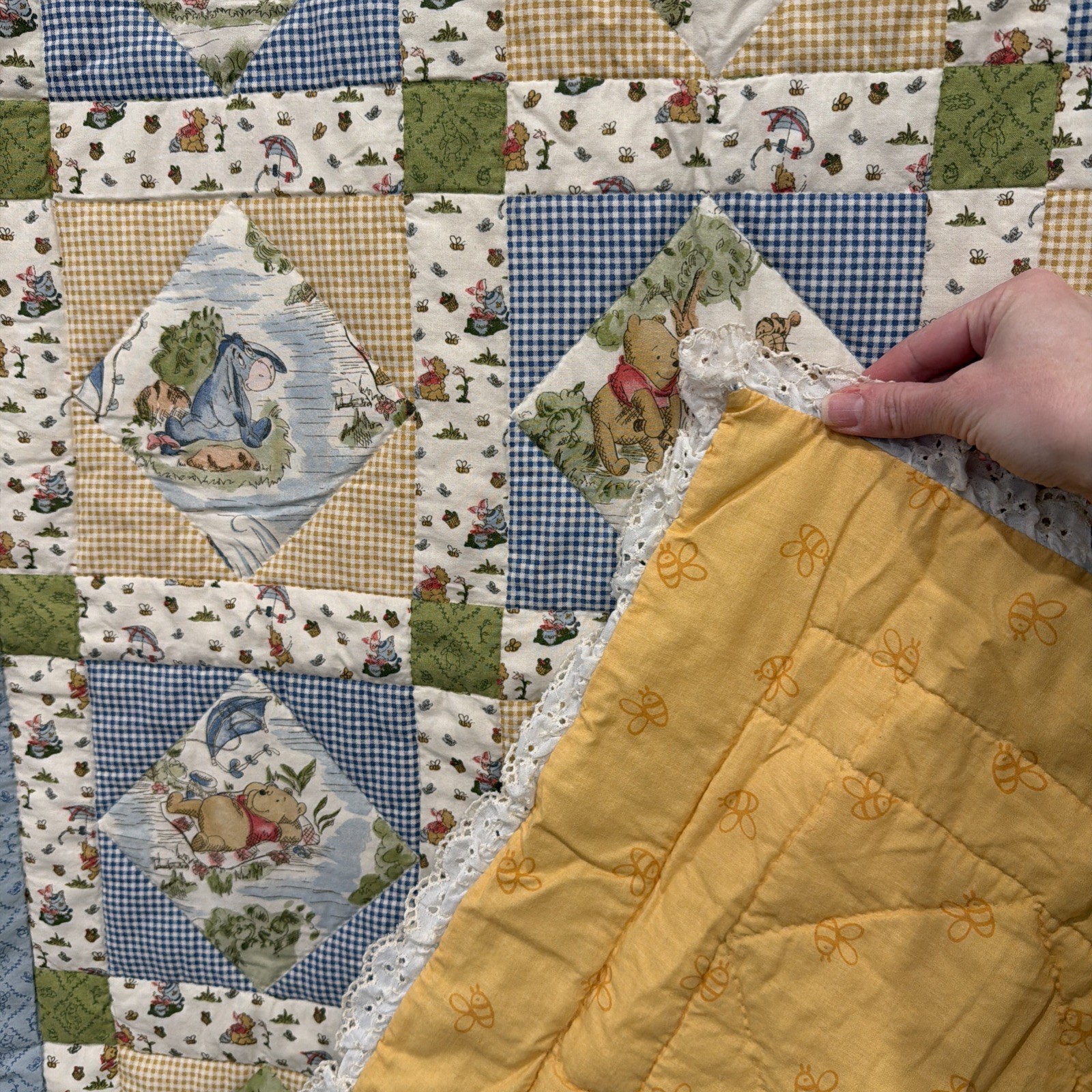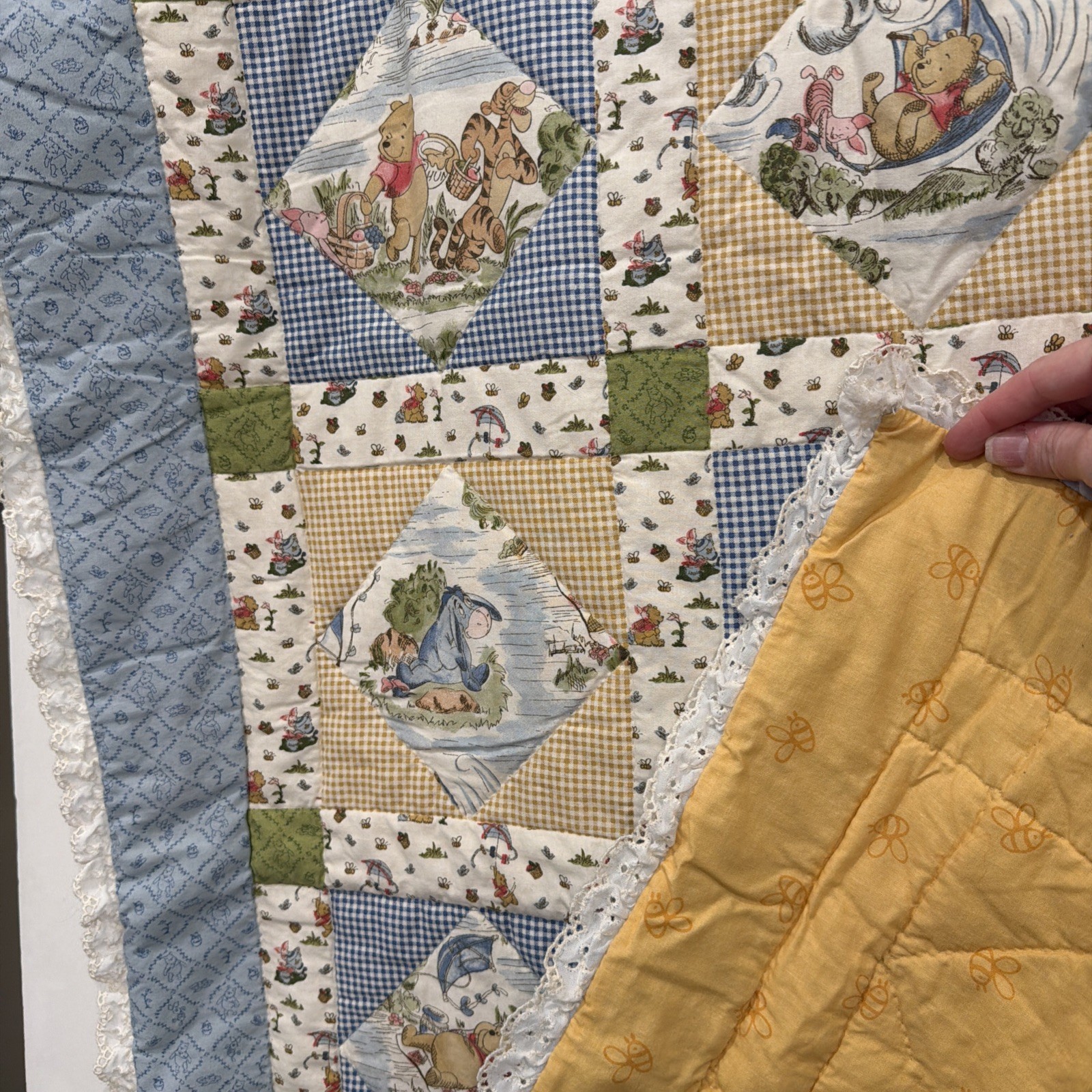 как выглядит WINNIE the POOH Friends BABY QUILT Blanket Handmade 41 x 32 Patchwork Lace фото