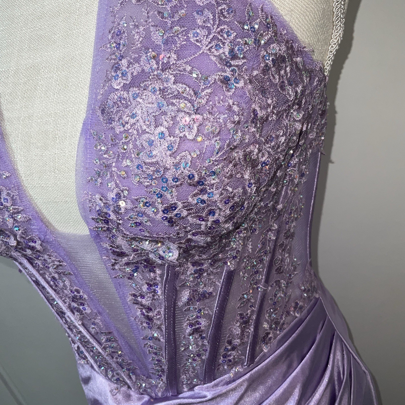 Stacees Dress Sz 4 Lilac Mermaid Sheer Corset Prom Pageant Formal Train Sequins