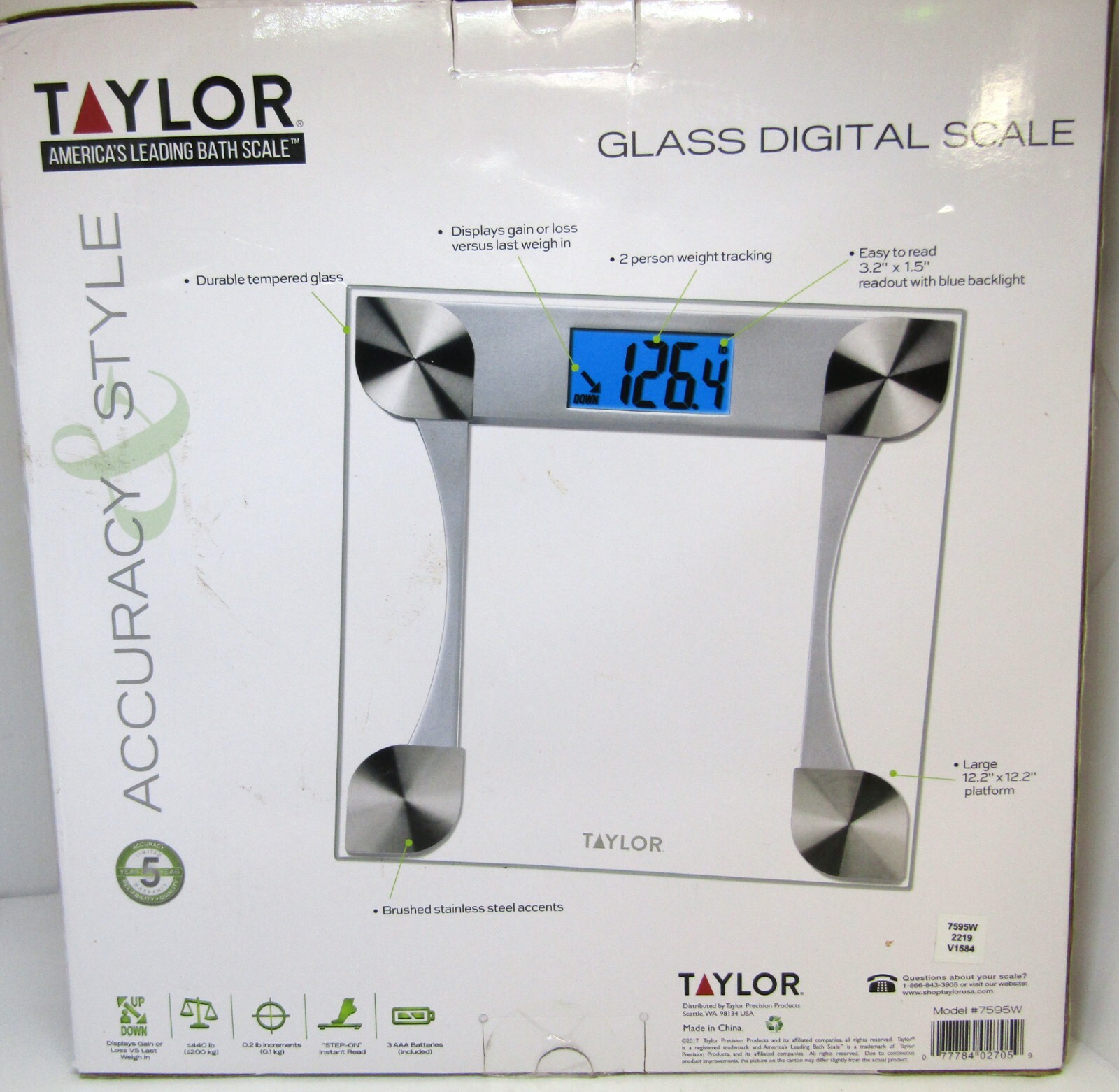 TAYLOR 440 LB DIGITAL GLASS SCALE WITH WEIGHT TRACKING.