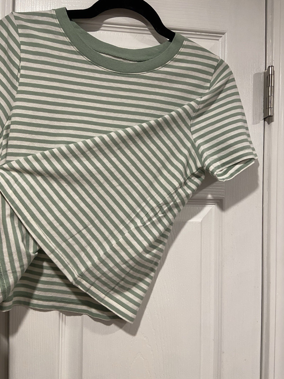 как выглядит NWOT Madewell Size S Sage Green White Striped Crop Tee Cotton Short Sleeve Top фото