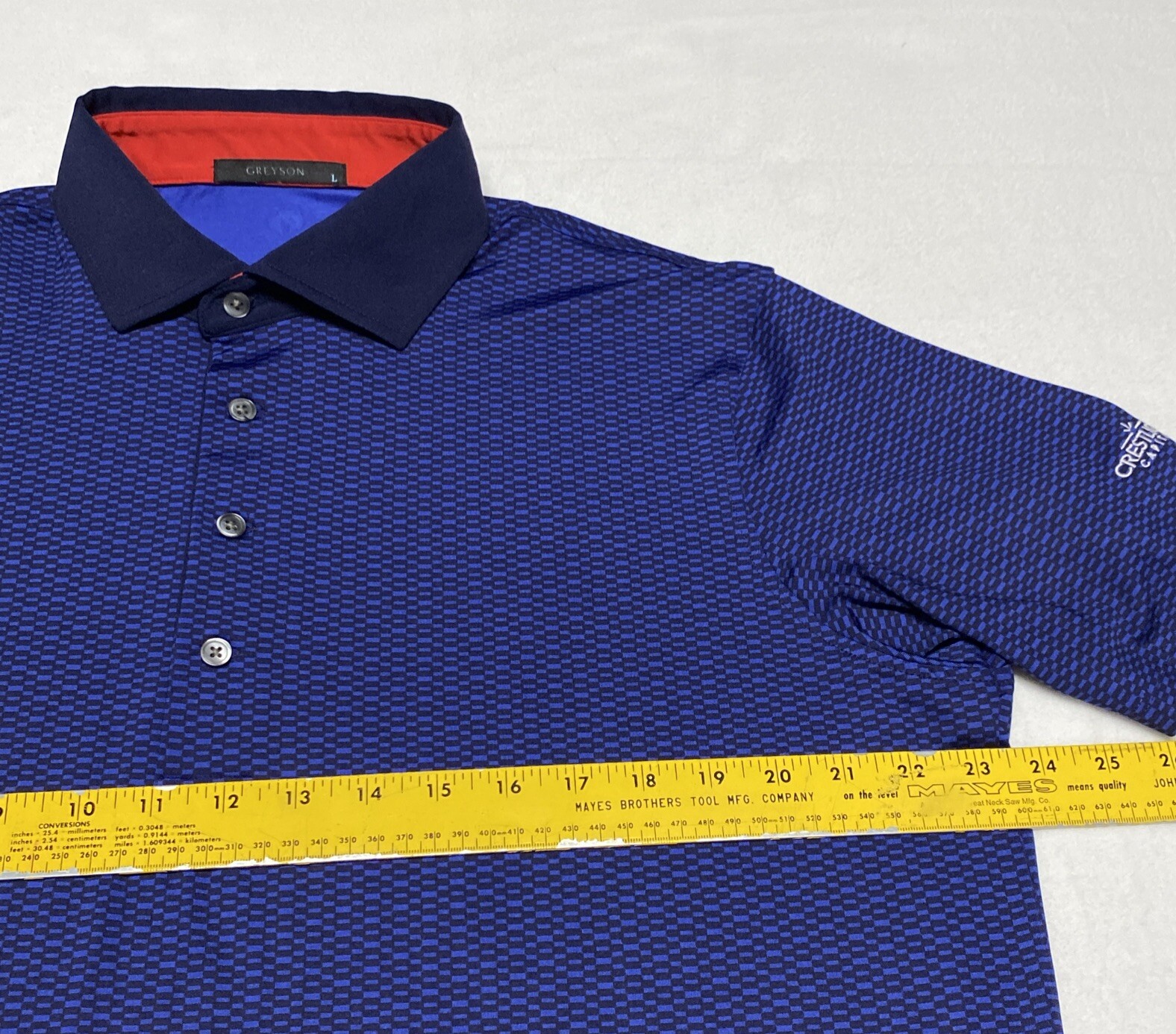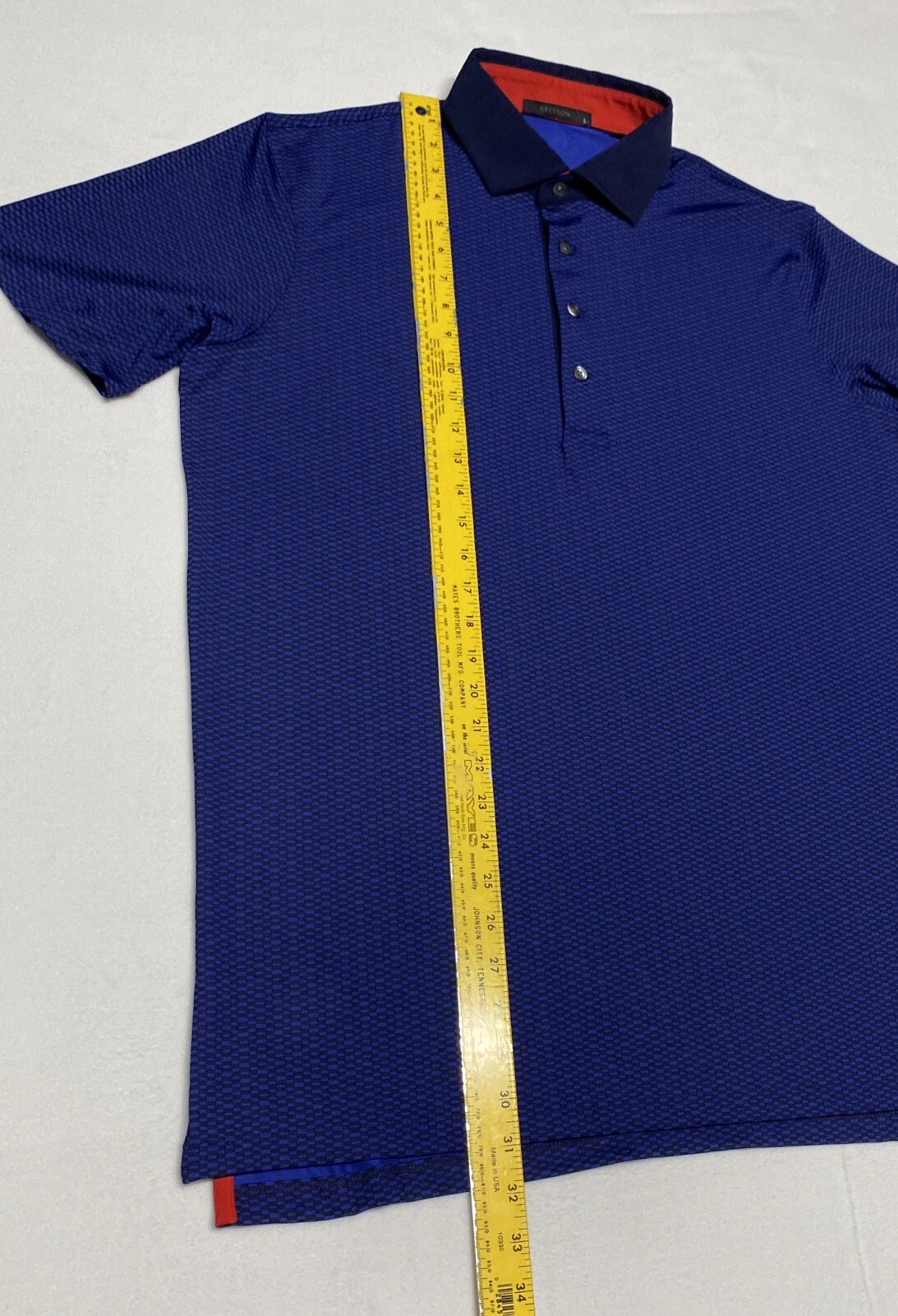 как выглядит Greyson Golf Polo Mens L Blue Black Geometric Square Performance Shirt Wolf Logo фото