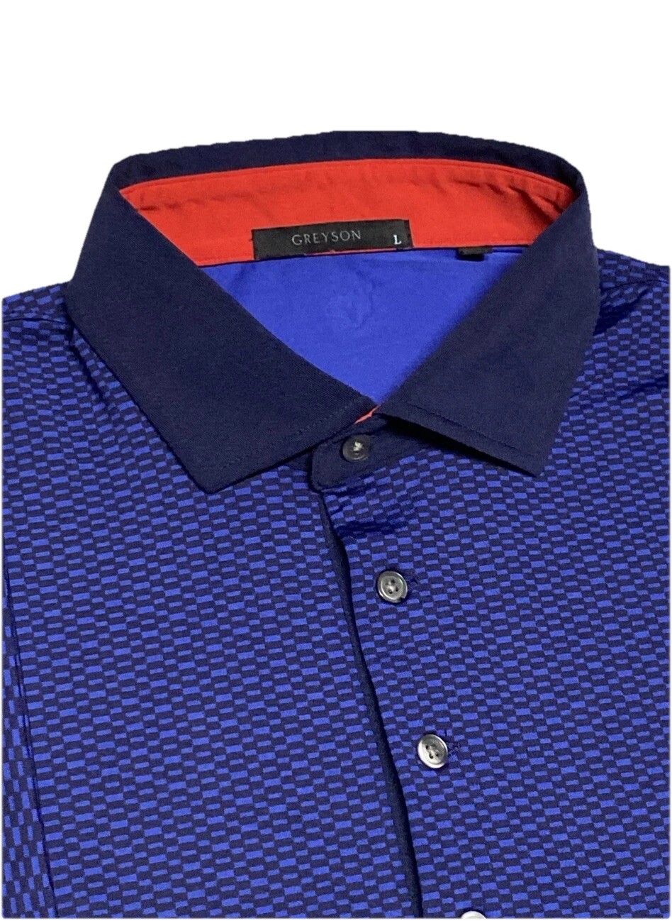 Greyson Golf Polo Mens L Blue Black Geometric Square Performance Shirt Wolf Logo