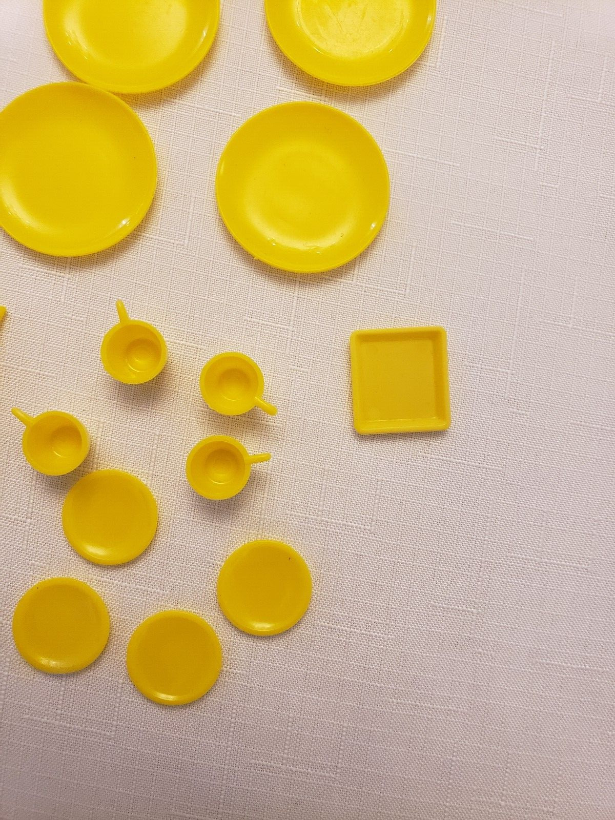 Barbie Yellow Dinnerware Cups, Plates, tray, pitcher plus container 14pcs