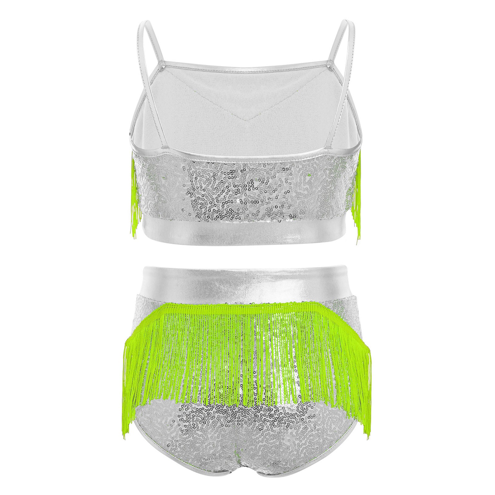 Kids Girls Competition Rhinestone Dancewear Tango Outfit Tassel Team Samba Mesh