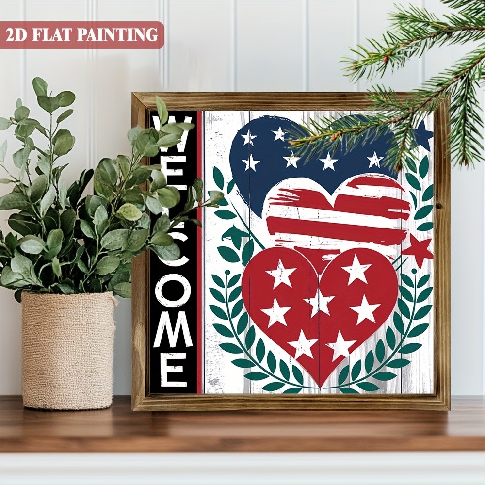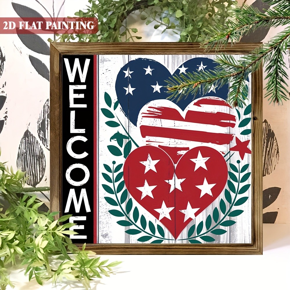 USA Flag Patriotic Welcome Wooden Plaque 4th Of July Heart Stars Rustic Decor