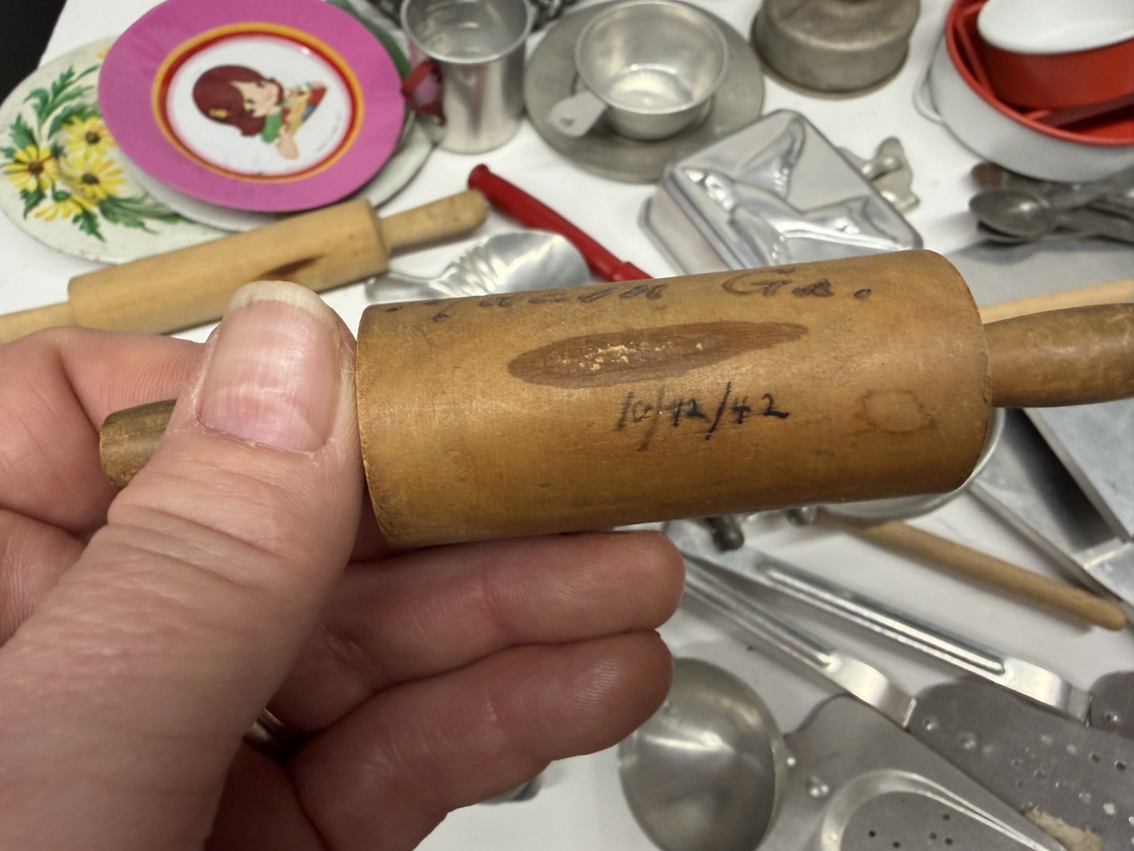как выглядит Vintage Aluminuum Kids Kitchen Utensils Pretend Kitchen Play Set Red Handle Cook фото
