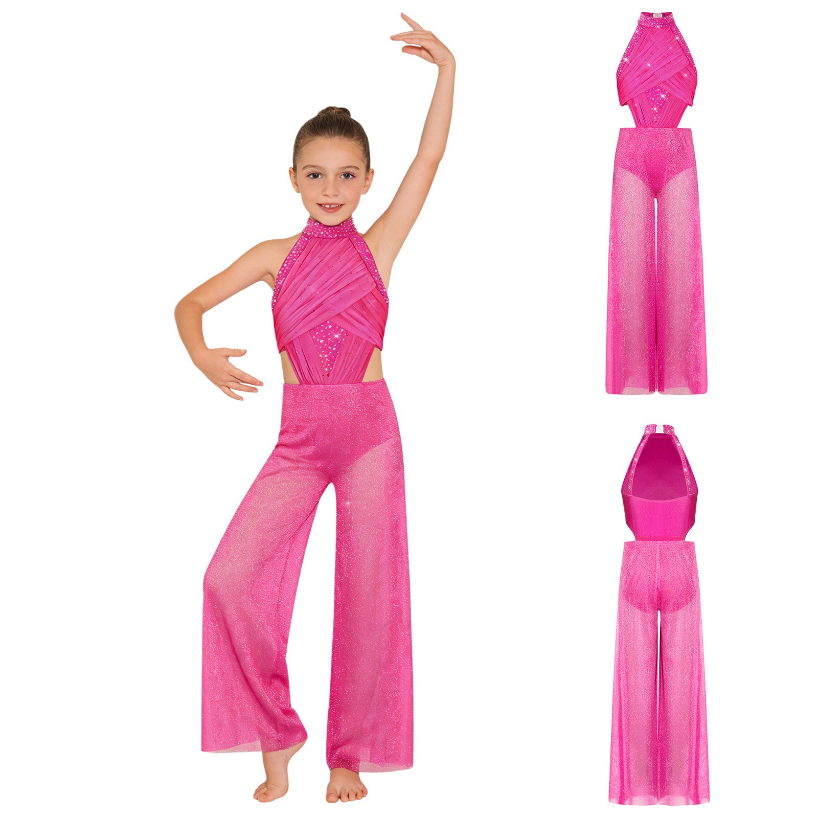как выглядит Kids Girls Bodysuit Unitard Dancewear Stage Jumpsuit Back Cutout Wide-Leg Mesh фото