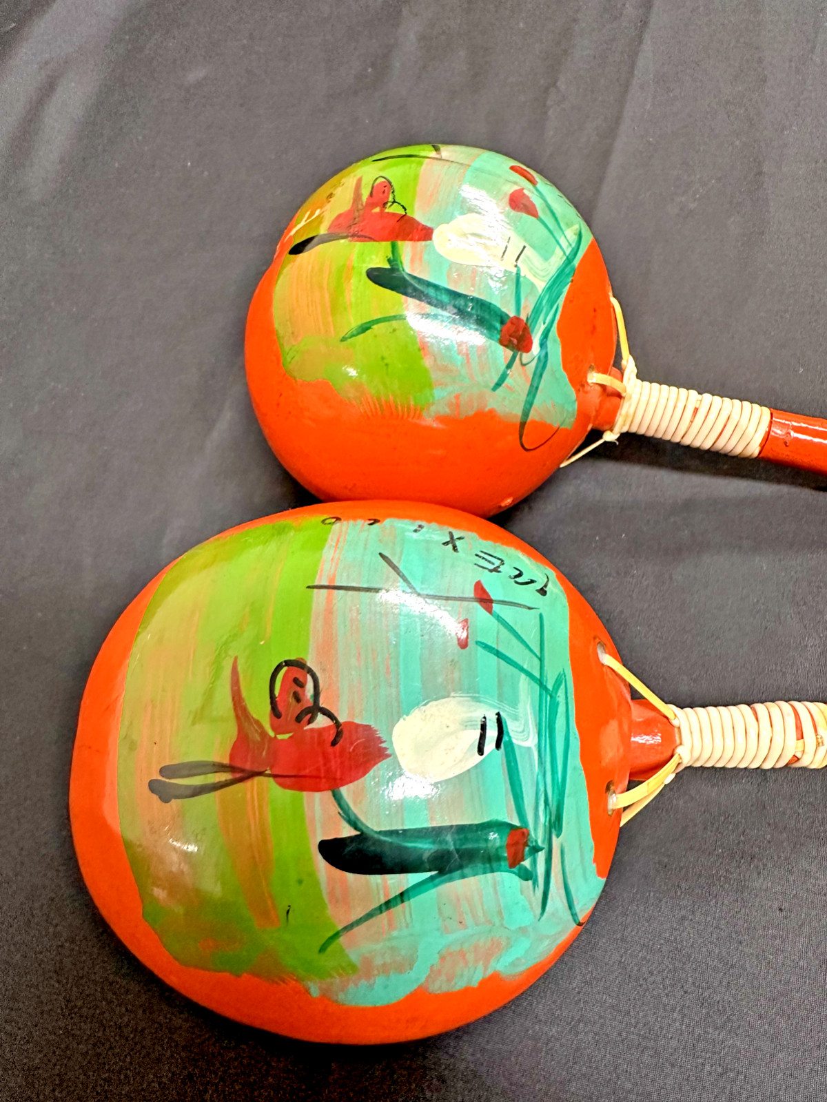 Vintage Pair of Hand Painted Real Gourd Maracas, Mexico, 8x3.5 - MINT