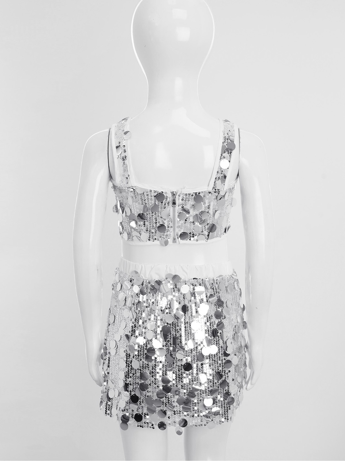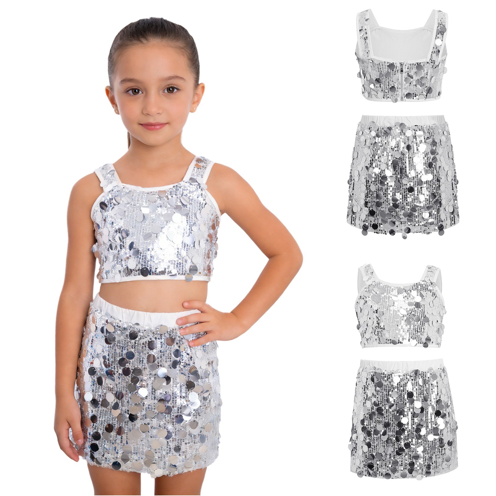Kids Girls Outfit Skirt Set Crop Top Costume Casual Dancewear Straps Shiny Jazz