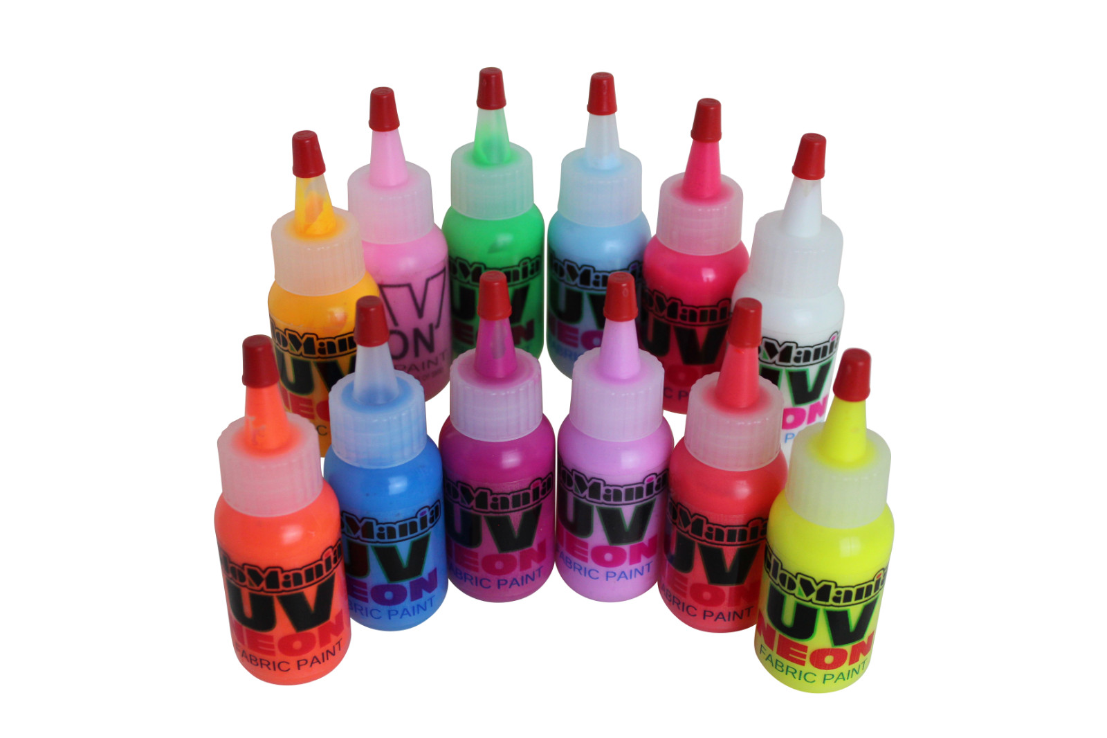 NEON FABRIC UV PAINTS,RAVE,PARTY, BLACK LIGHT, FLOURESCE TEE SHIRT HAT CANVAS