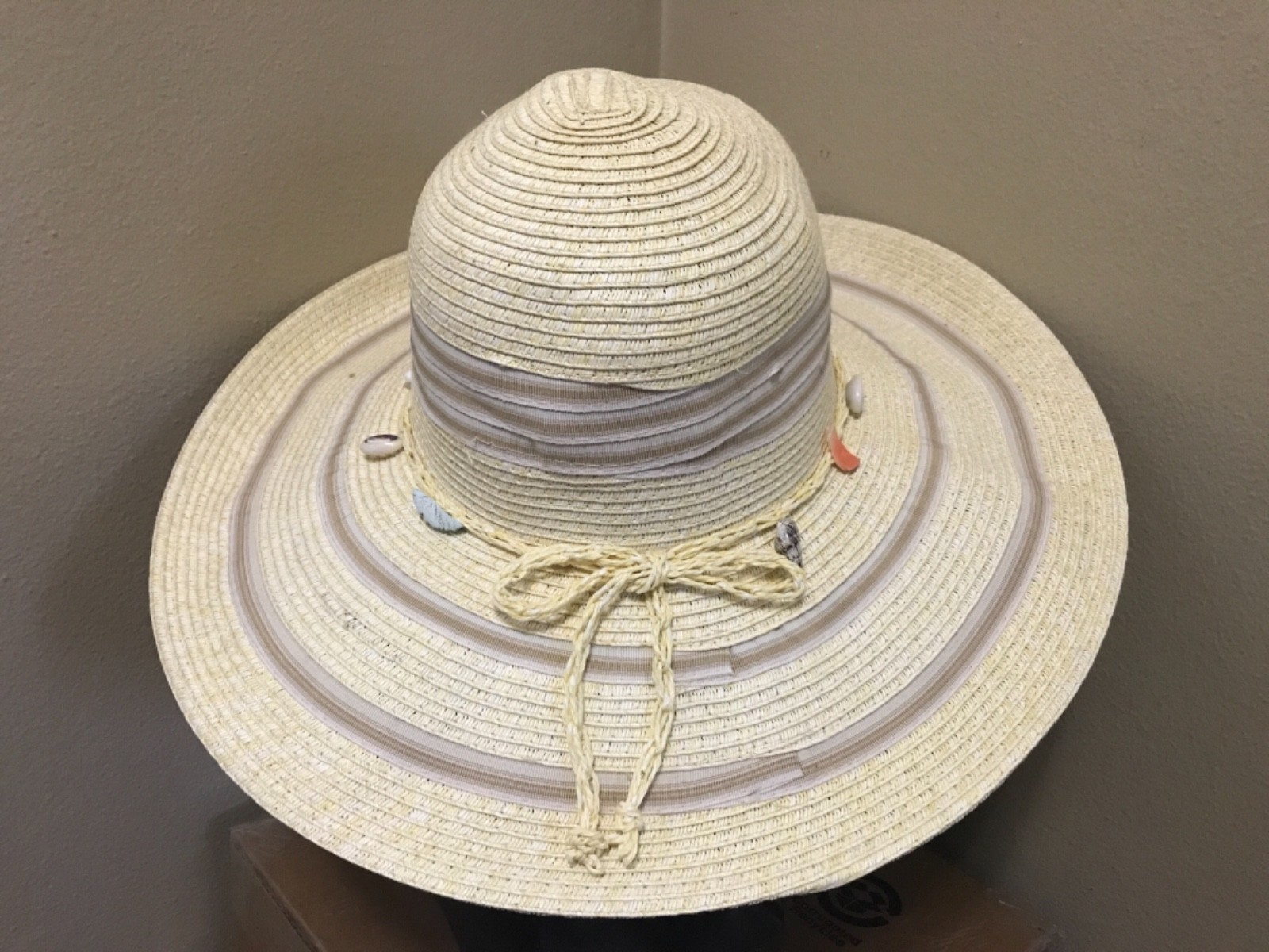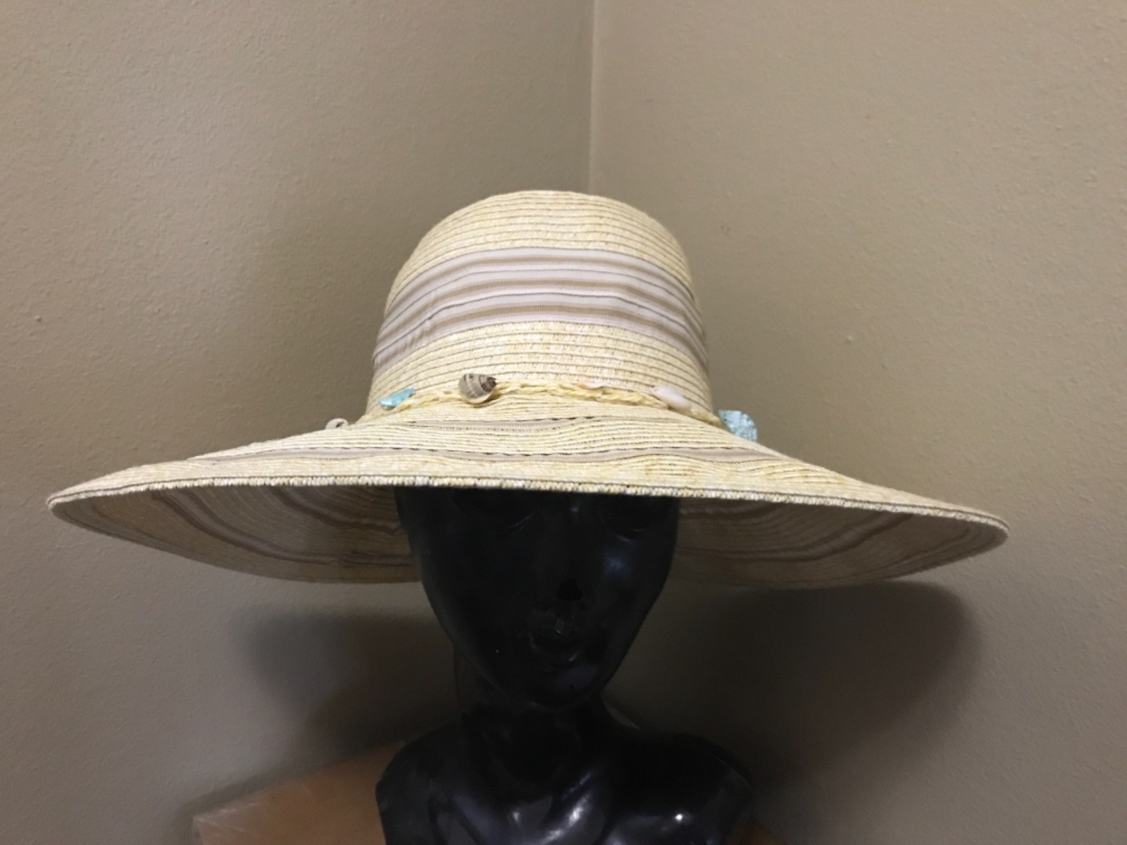 как выглядит Ladies Wide Brim Ivory Toyo Straw/Fabric Swirl Floppy Summer Sun Hat shell band фото