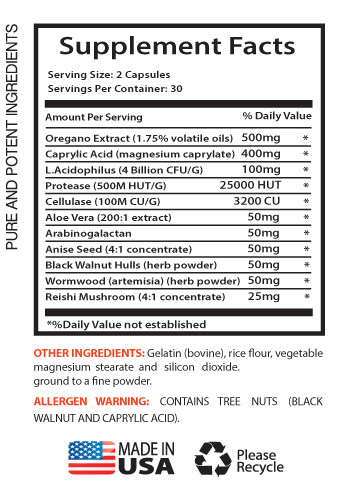 Active Ingredients: Oregano, OREGANO OIL, cranberry extract, MILK THISTLE, CLA Oil, Tonalin Extract, Green Coffee, black walnut leaf powder, cinnamon pills, KOREAN GINSENG, Acai Powder