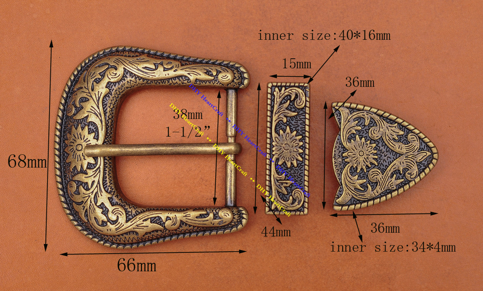 как выглядит Antique Brass Western Belt Buckle Three Piece Set Floral Design Unisex 1 1/2" фото