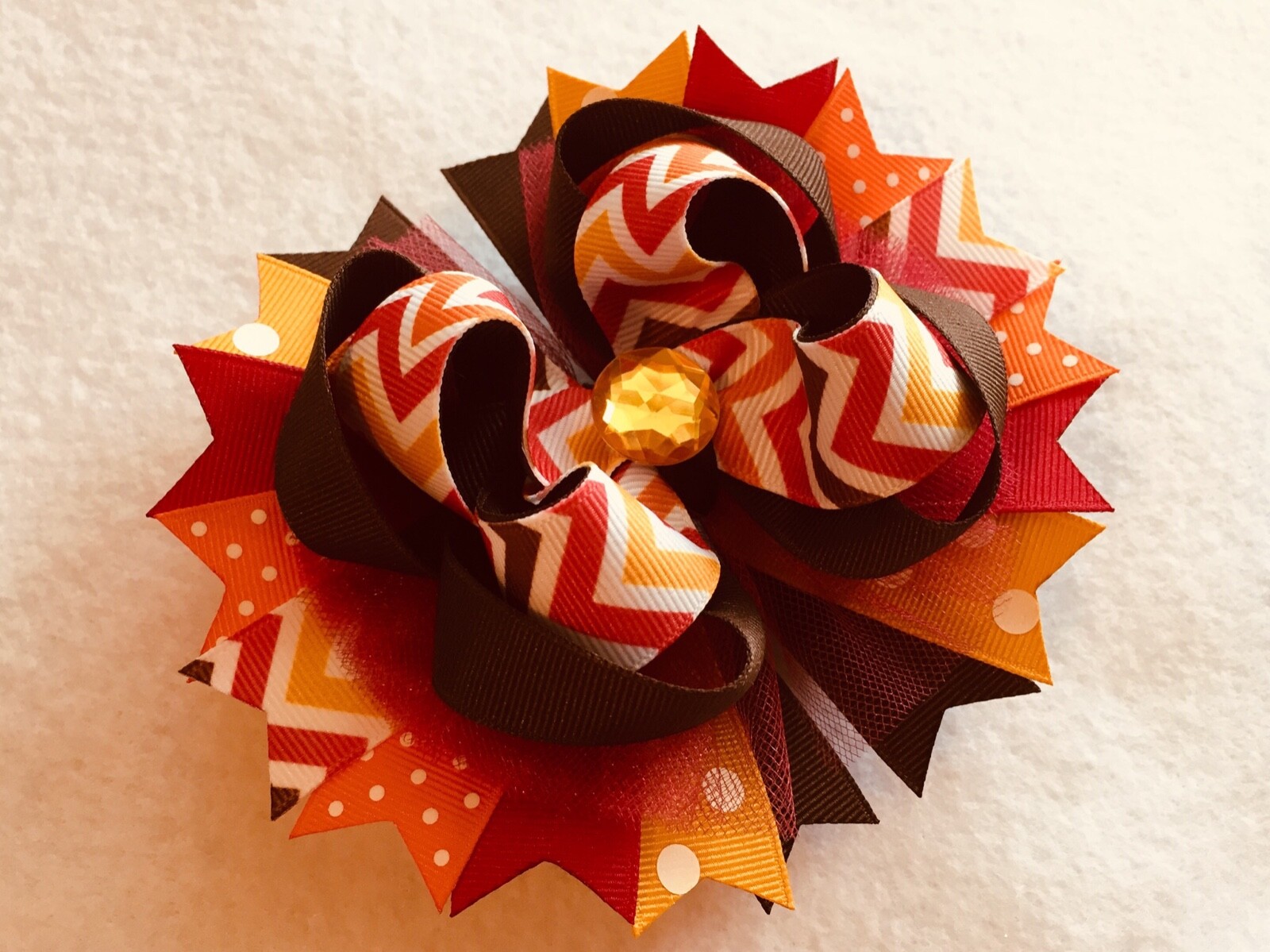 Handmade Fall Colored Orange Brown Layered Boutique Hair Bow Clip with Bling