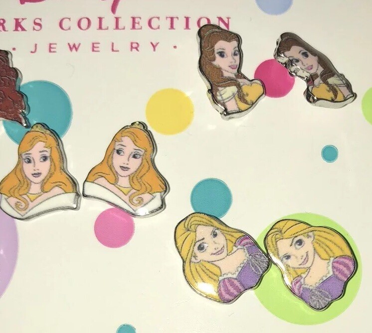 как выглядит Disney Parks Princess Merida Belle Aurora Jasmine Rapunzel Earrings Set of 5 NEW фото