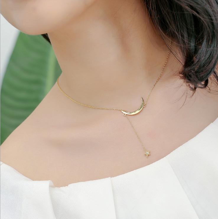 Gold Sterling Silver 925 CZ Crescent Moon And Star Pendant Necklace Choker K35