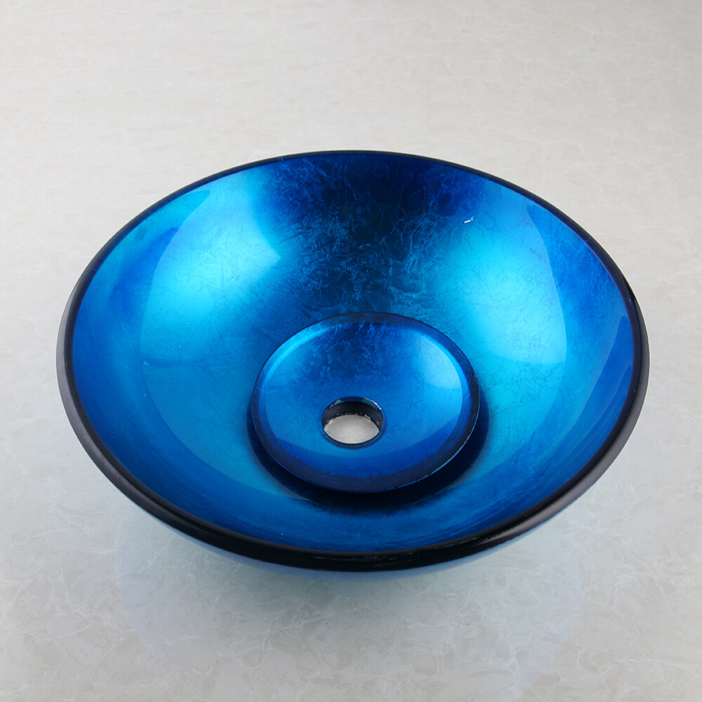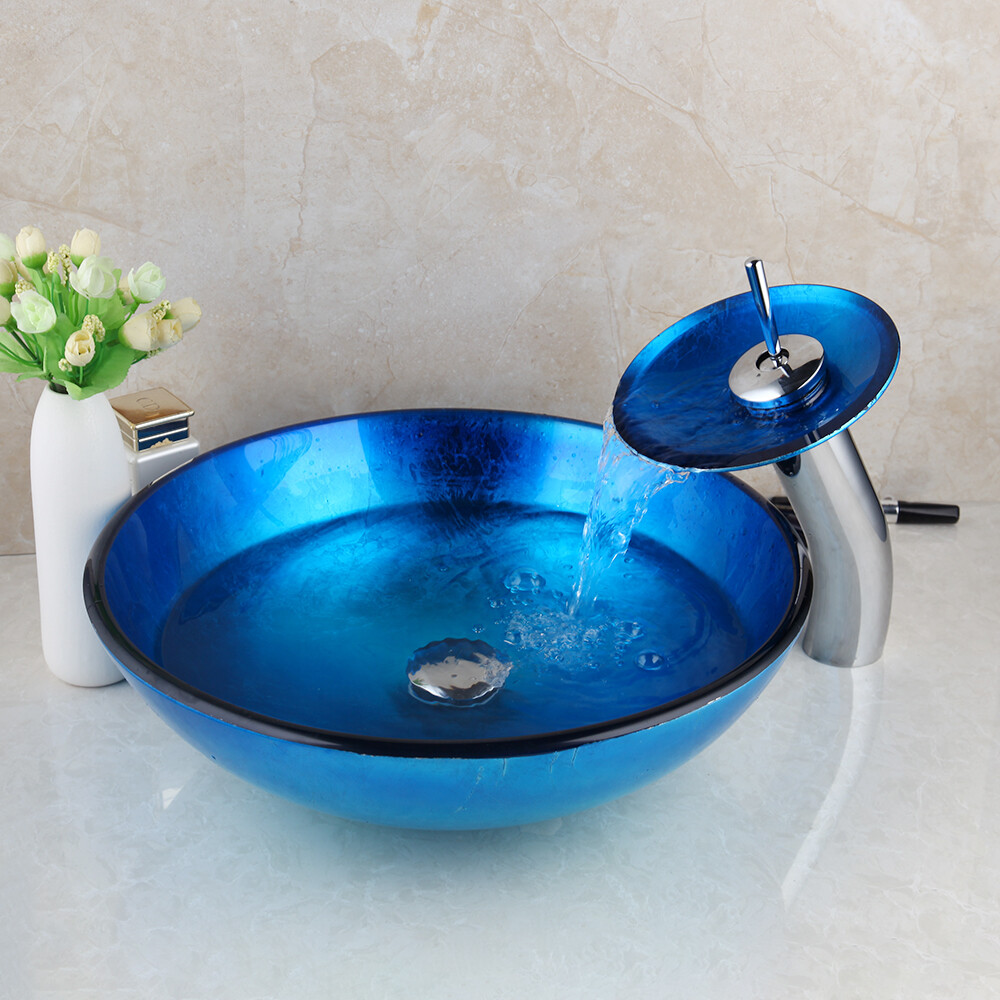 Blue Bathroom Glass Vessel Sink Round Basin Bowl Combo Mixer Faucet Drain Set