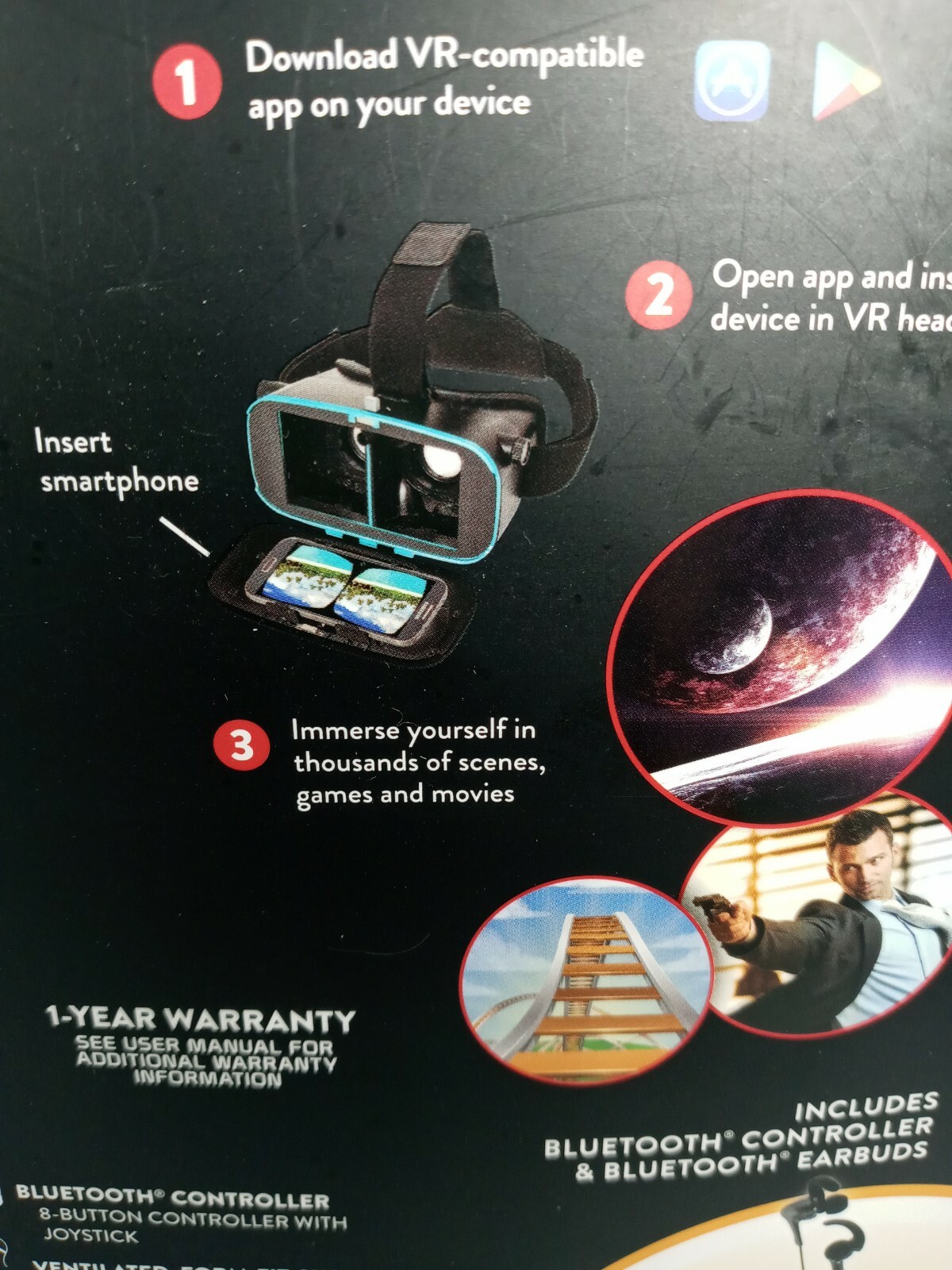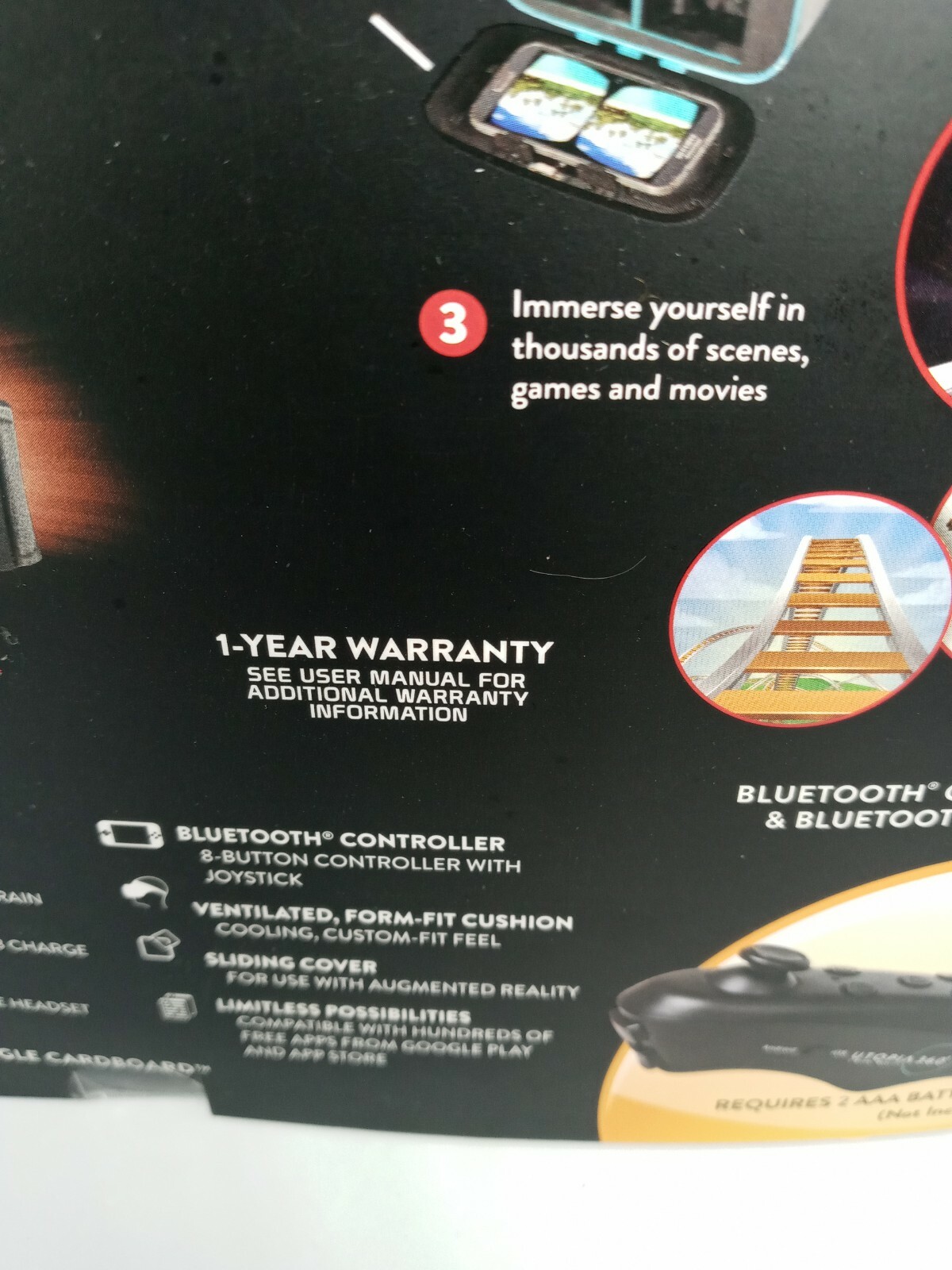 Особенности: Built-in Action Button, Bluetooth Earbuds, Bluetooth Controller, Ultra-Compatible, Dual Adjustable Focus, Full 360 Experience, Lucidview Lens System, Charge Cable, Powered by Your Device, Ventilated Form Fit Cushion, Sliding Cover