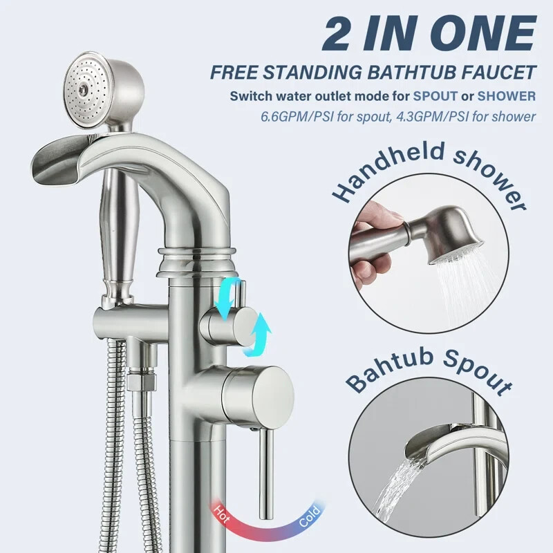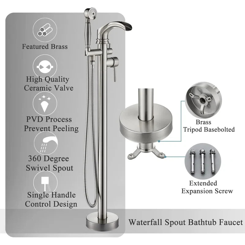 Freestanding Bathtub Faucet Tub Filler Waterfall Floor Mounted Brushed Nickel