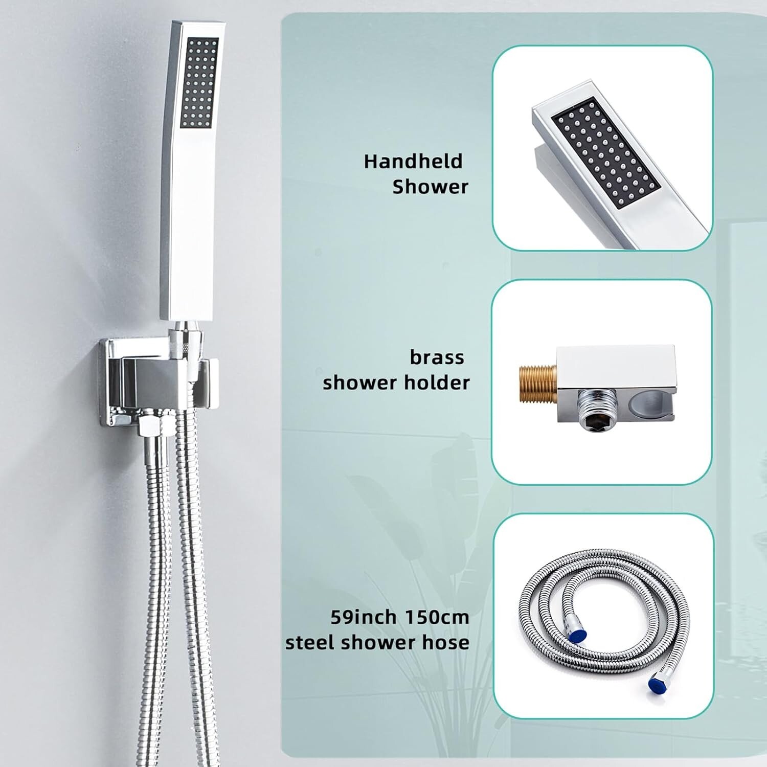 Items Included: shower arm, rainfall shower head, shower hose, handheld shower, Mixing Valve