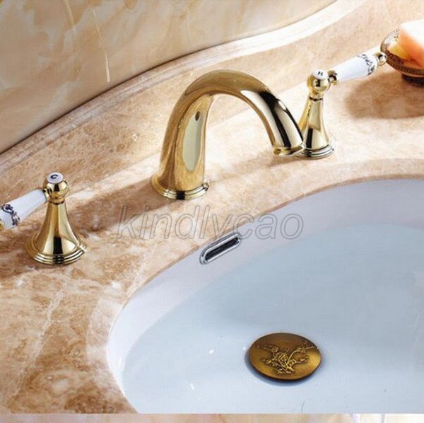 как выглядит Gold Color Brass Widespread Bathroom Faucet 3 Holes Basin Sink Mixer Tap Kxz105 фото