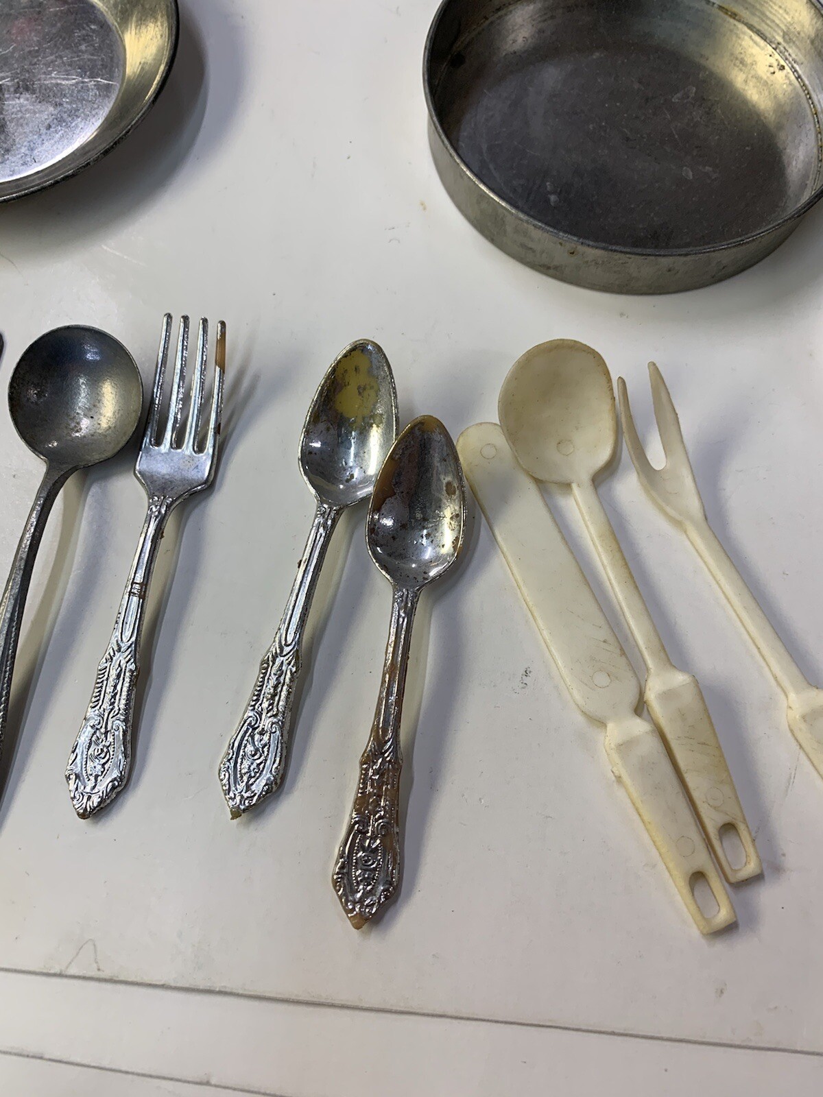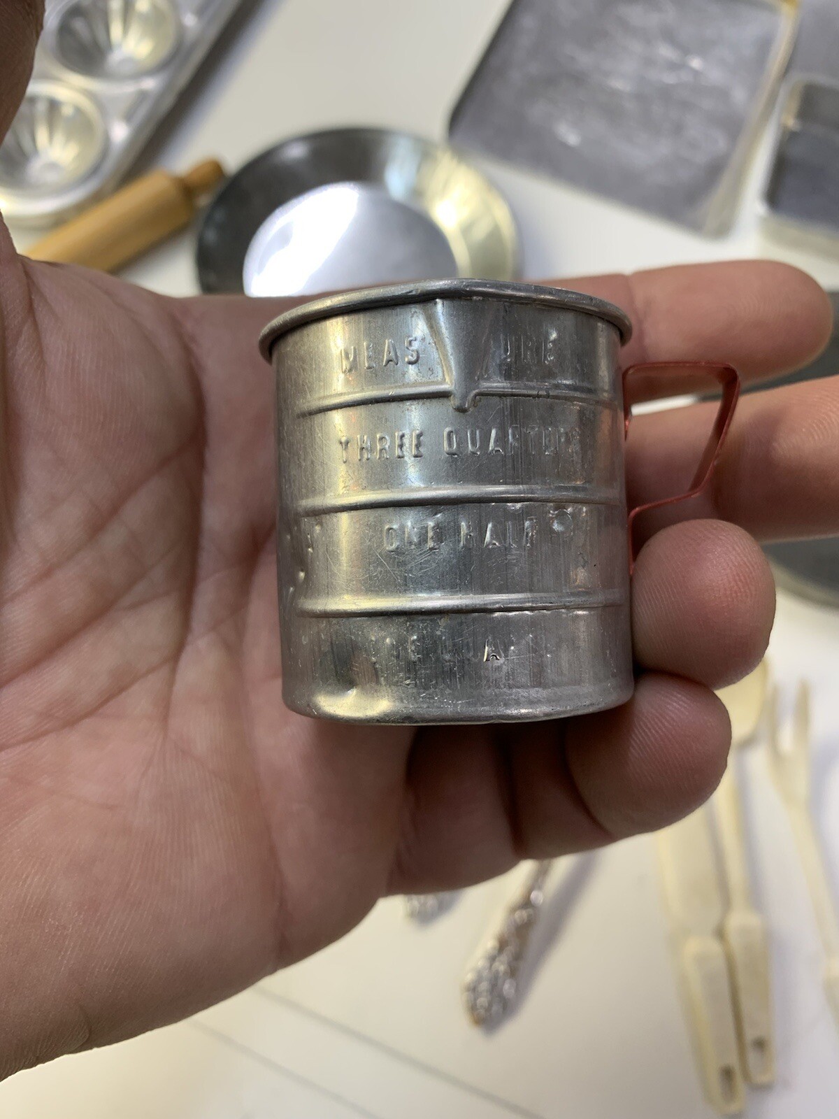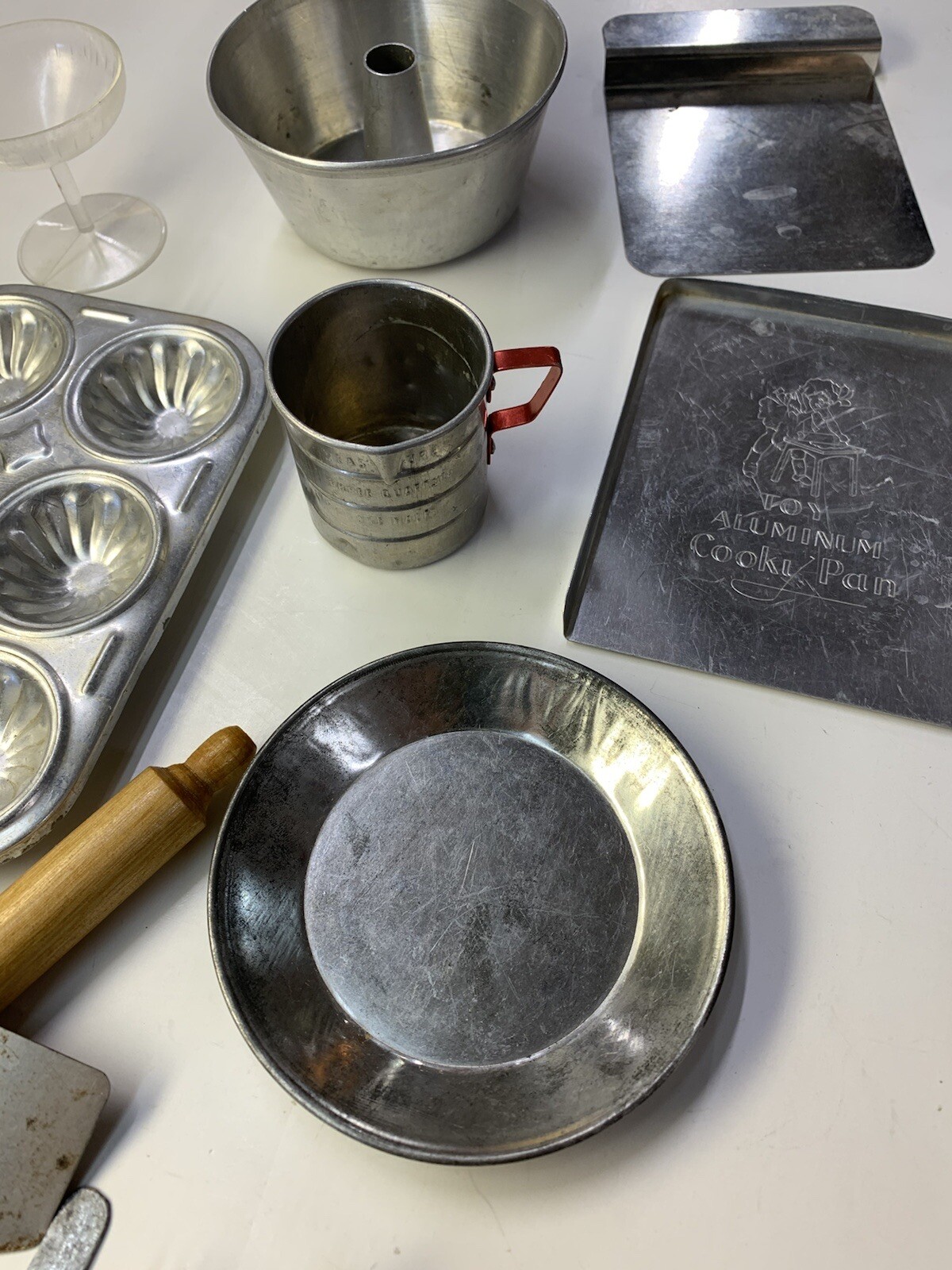 1950 s Vintage Aluminum Toy Cookware, Bakeware, Tea Cups, Utensils Etc.