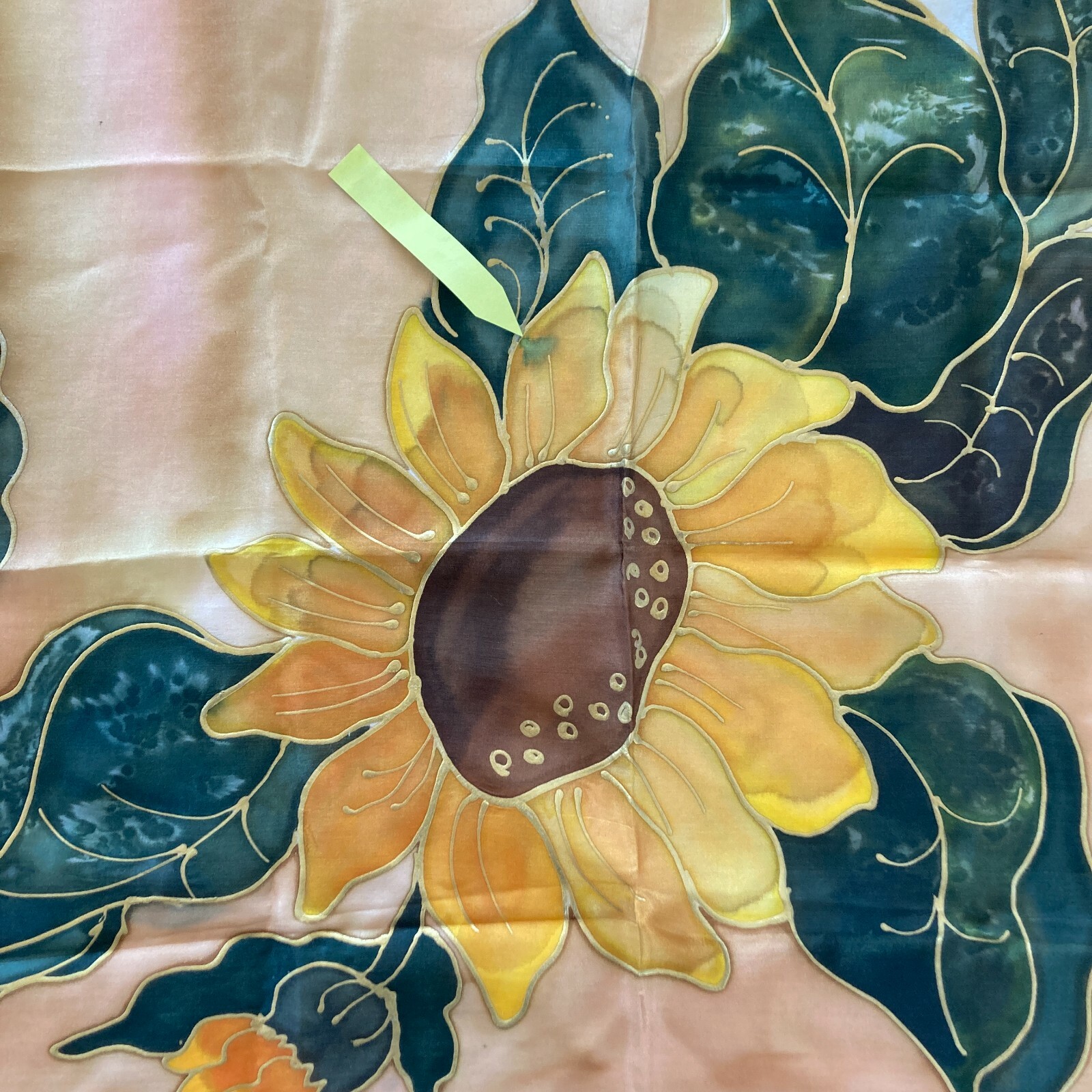 Boho Handpainted Hand Rolled Scarf Brown Floral Gold Sunflower Silk Signed
