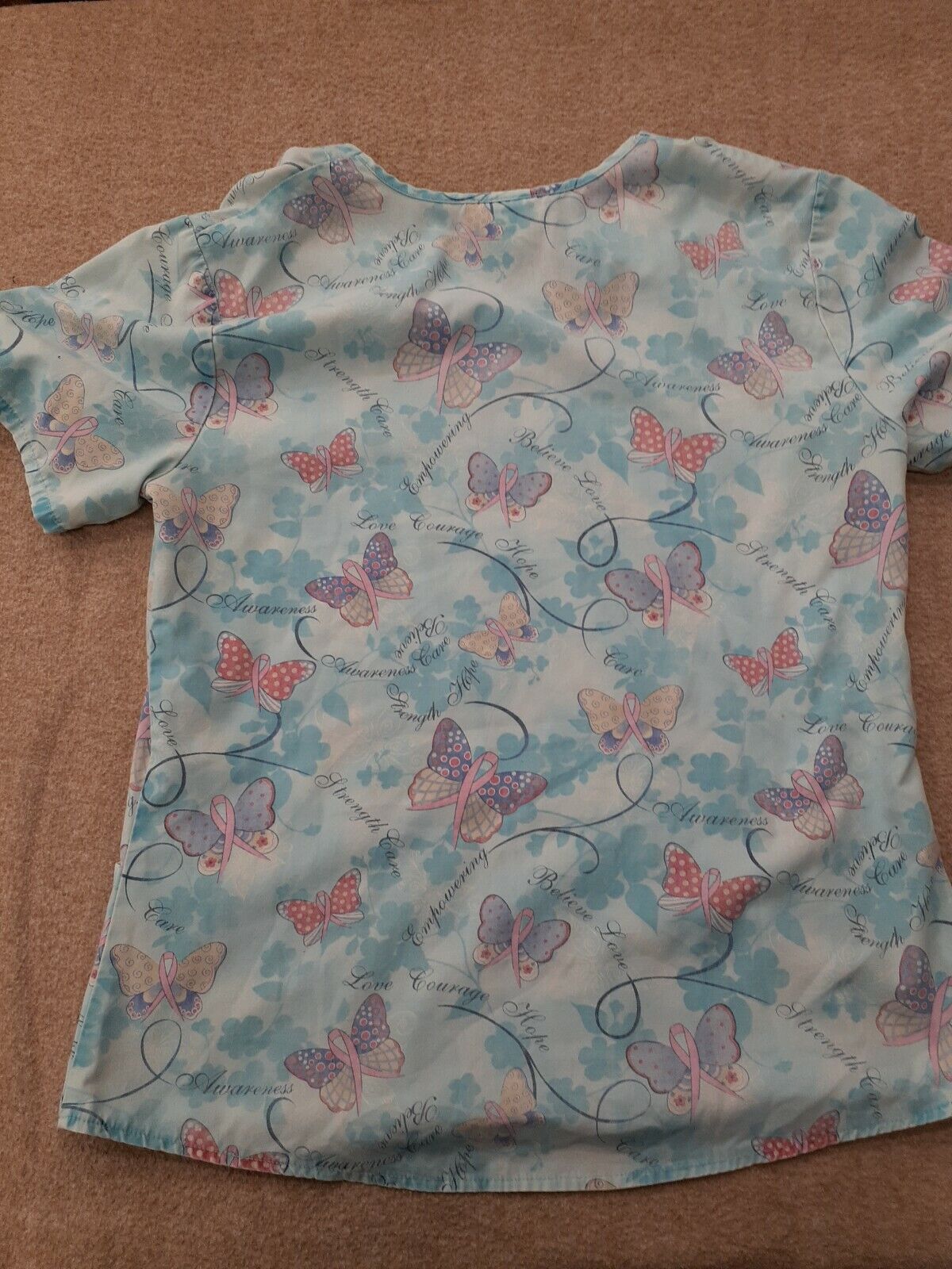 SB Scrub Top S Breast Cancer Ribbon Butterfly Short Sleeve Medical Nurse Womens