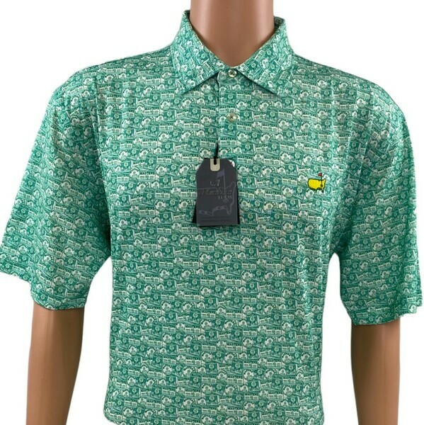 как выглядит 2025 MASTERS Badge Design Mens Performance Tech Stretch Golf Polo Shirt Green фото