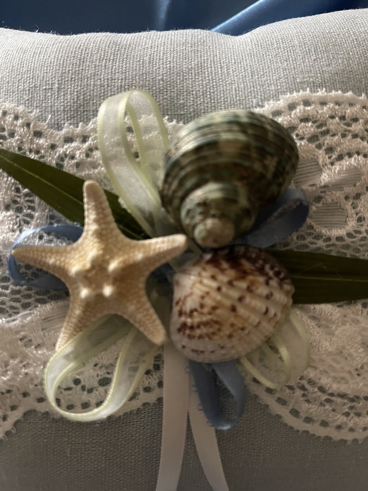 Blue Linen With Wide Lace Beach Wedding Ring Bearer Pillow
