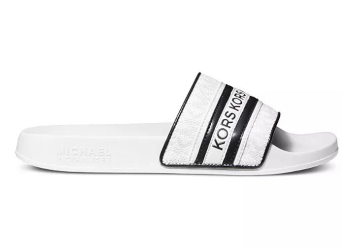 New MICHAEL KORS Women's Gilmore MK Signature Logo Pool Slides lux stripe White