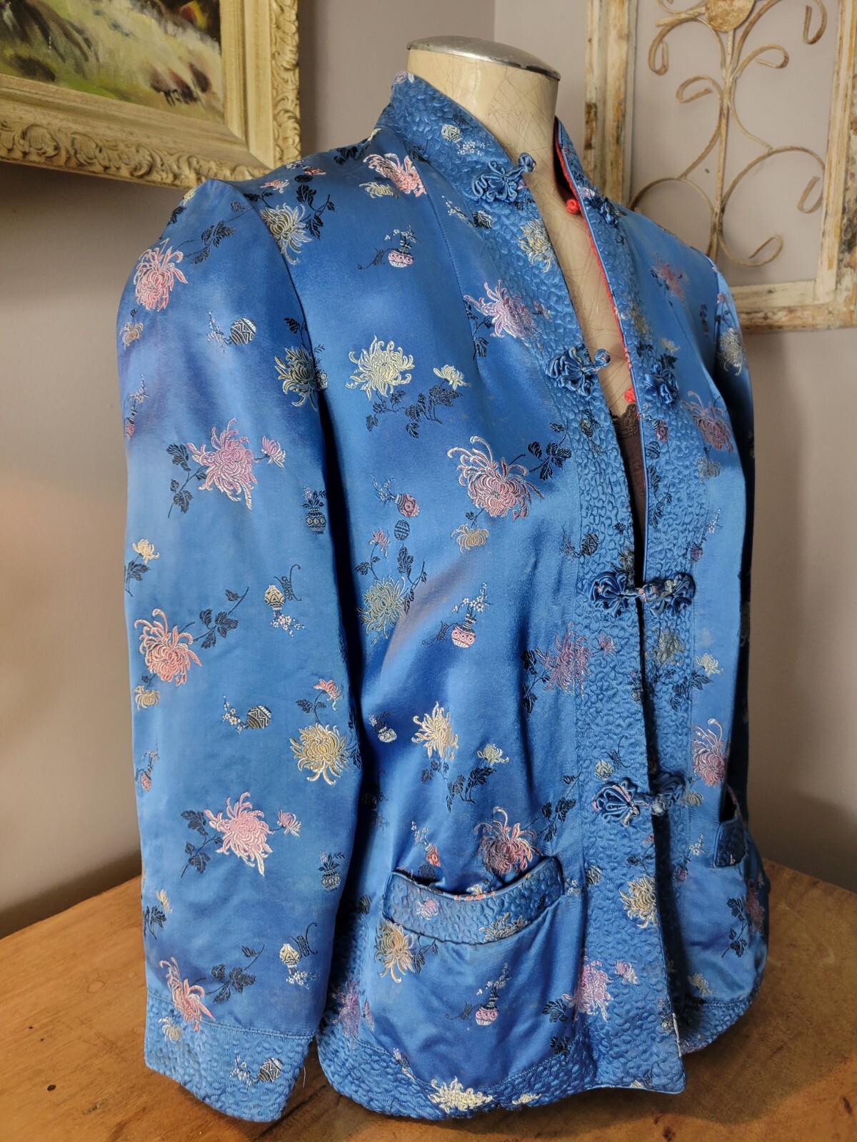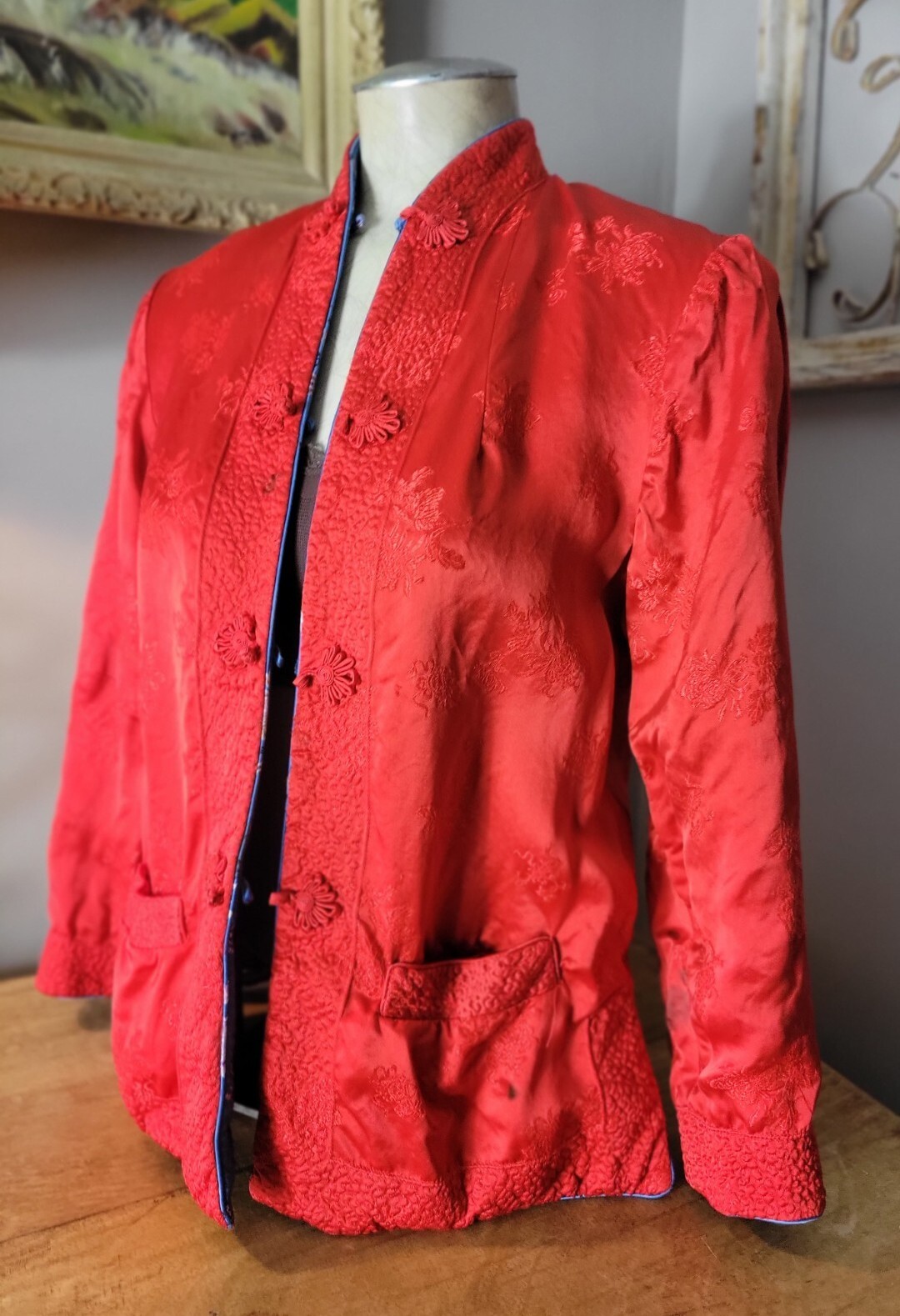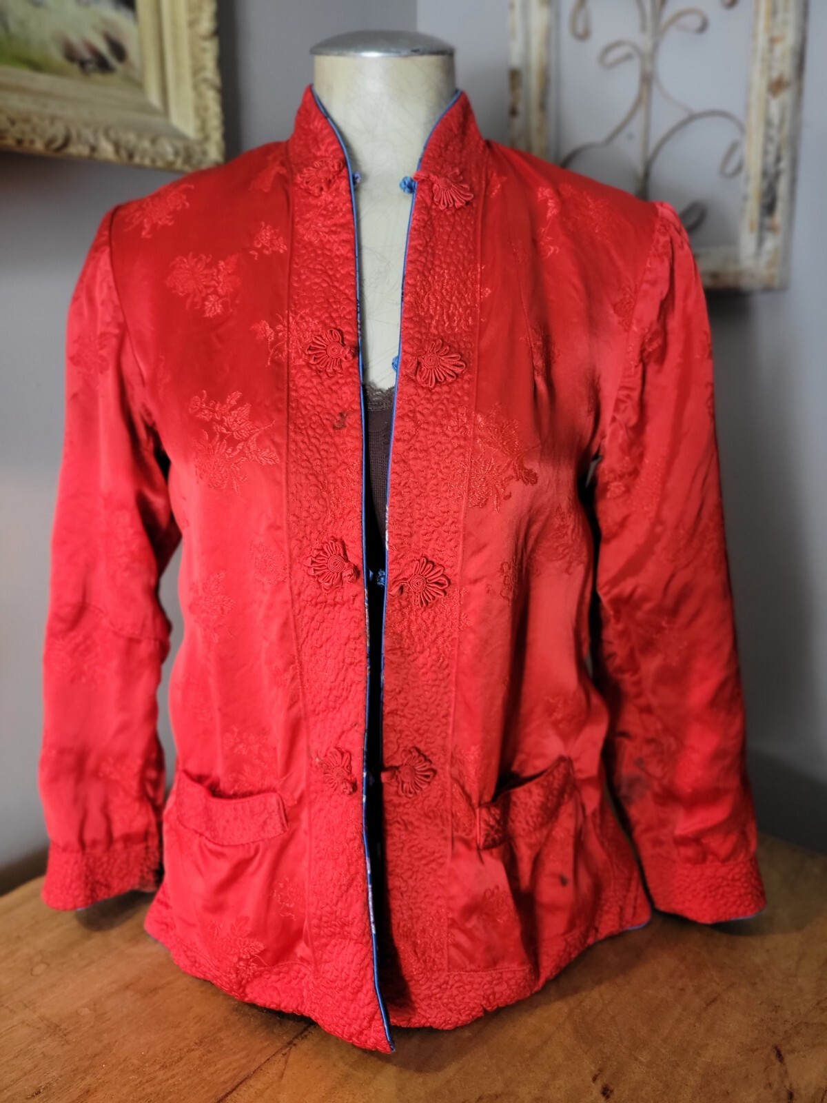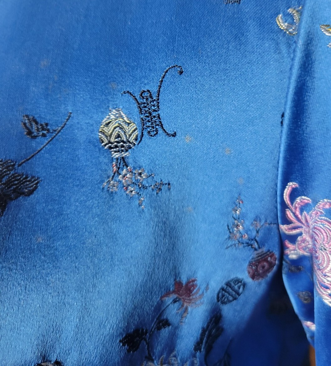 как выглядит Vintage Silk Blue Red Asian Embroidered kimono floral Jacket S M reversible фото