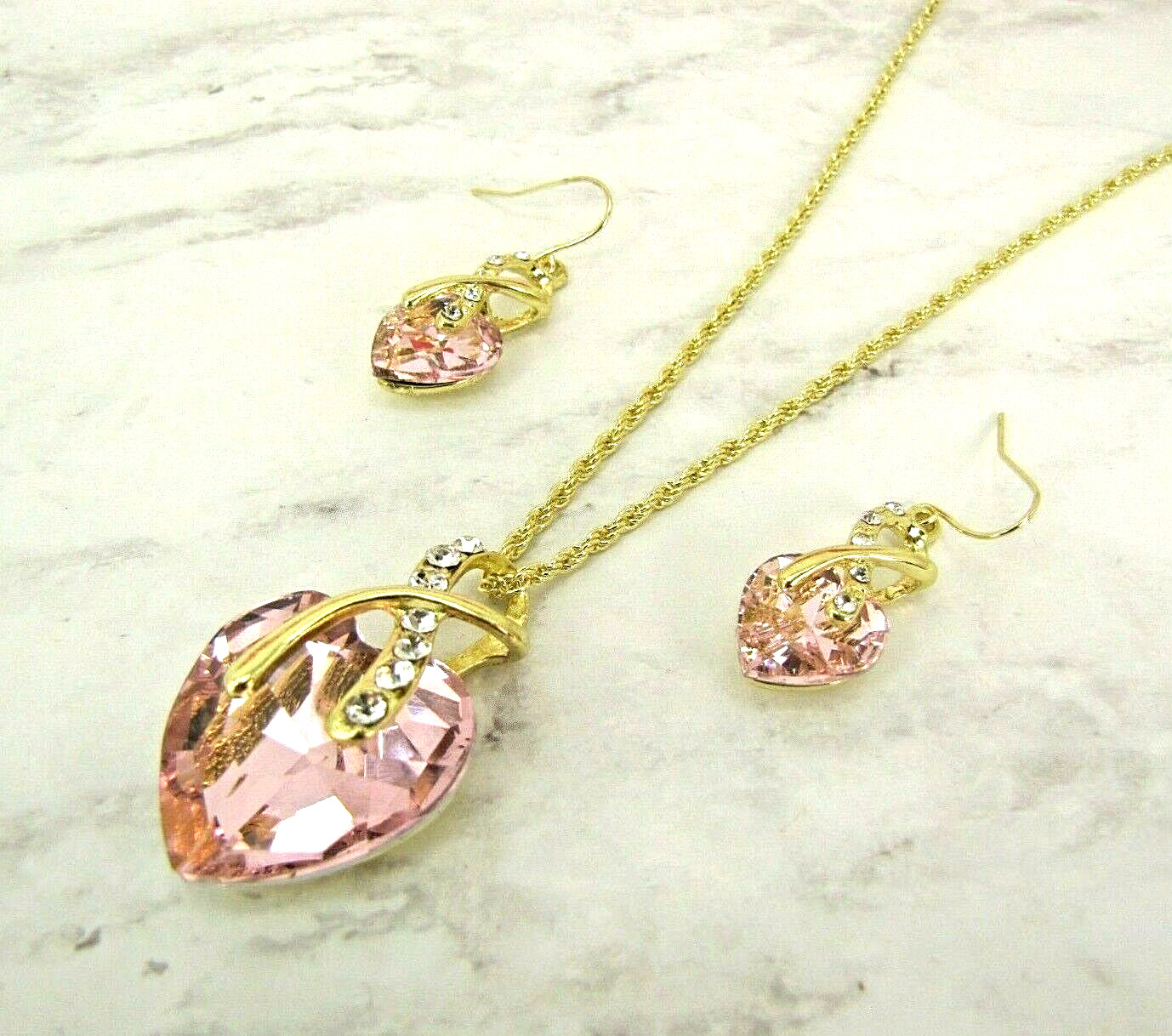 Pink Crystal Heart Pendant Necklace Earring Set, Large Pink Love Heart New