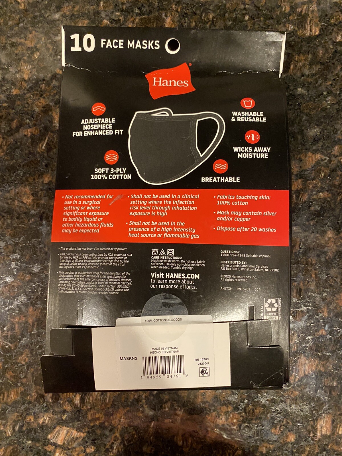 Hanes Face Masks, 10 pack, Black