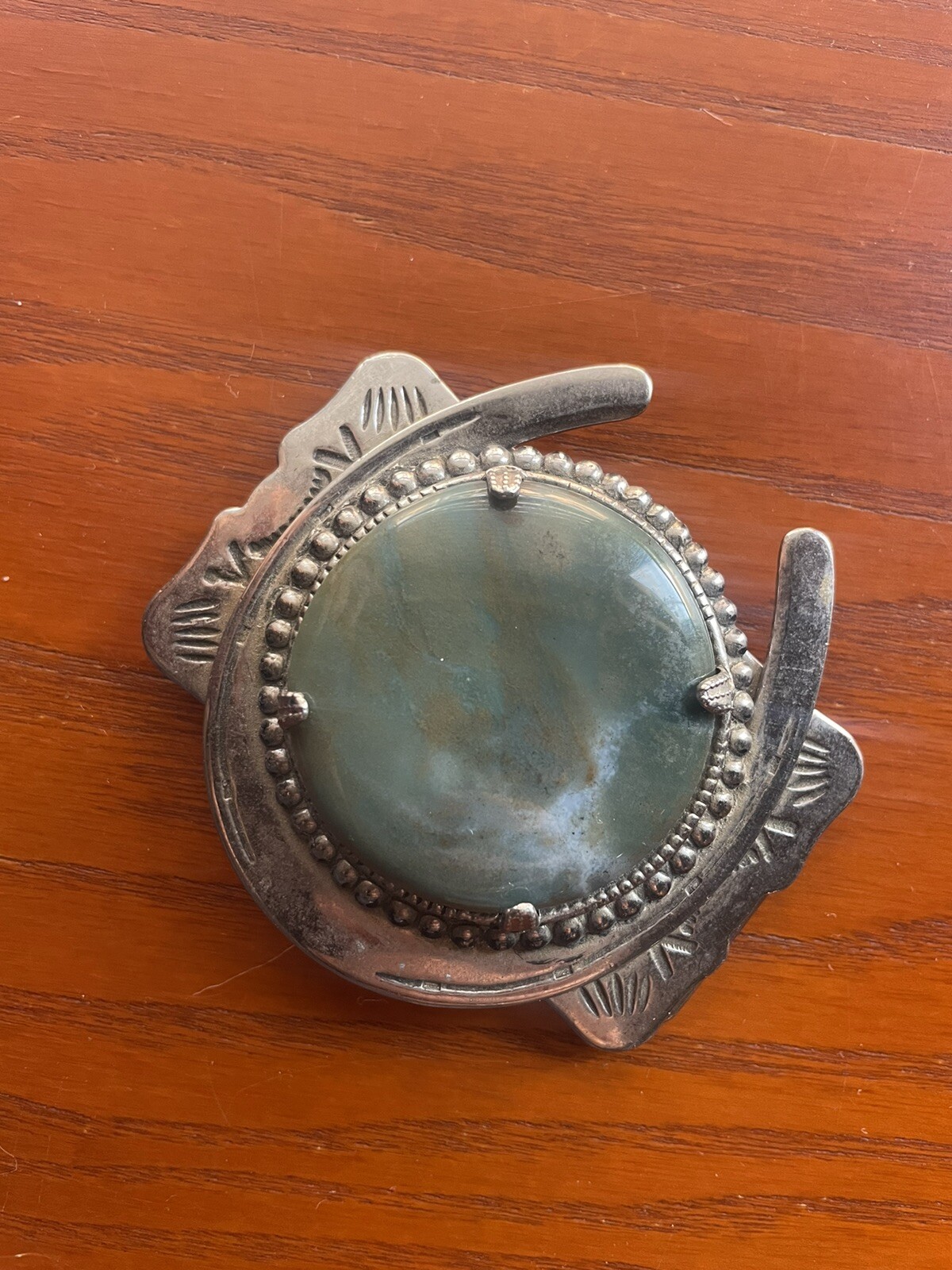 как выглядит Horse Shoe Belt Buckle with Green Stone Stamped Old Pawn Repro Fred Harvey Repro фото