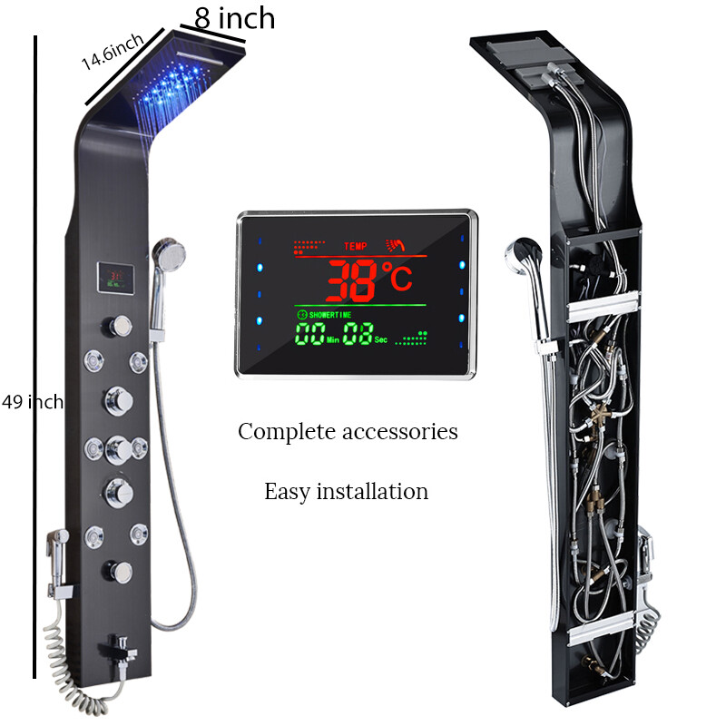 Особенности: Waterfall&rainfall shower head, handheld shower, massage jets sprayer, tub spout, Integrated Water Filtering, LED Lights, Ozone Sterilization, Quick Cleaning, Water Conservation, Black Shower System