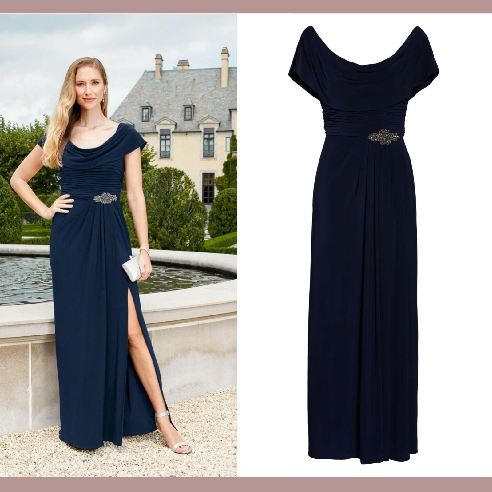 NWT 199 Alex Evenings 8 Cowl Neck Beaded Waist Gown in Navy Blue G1014