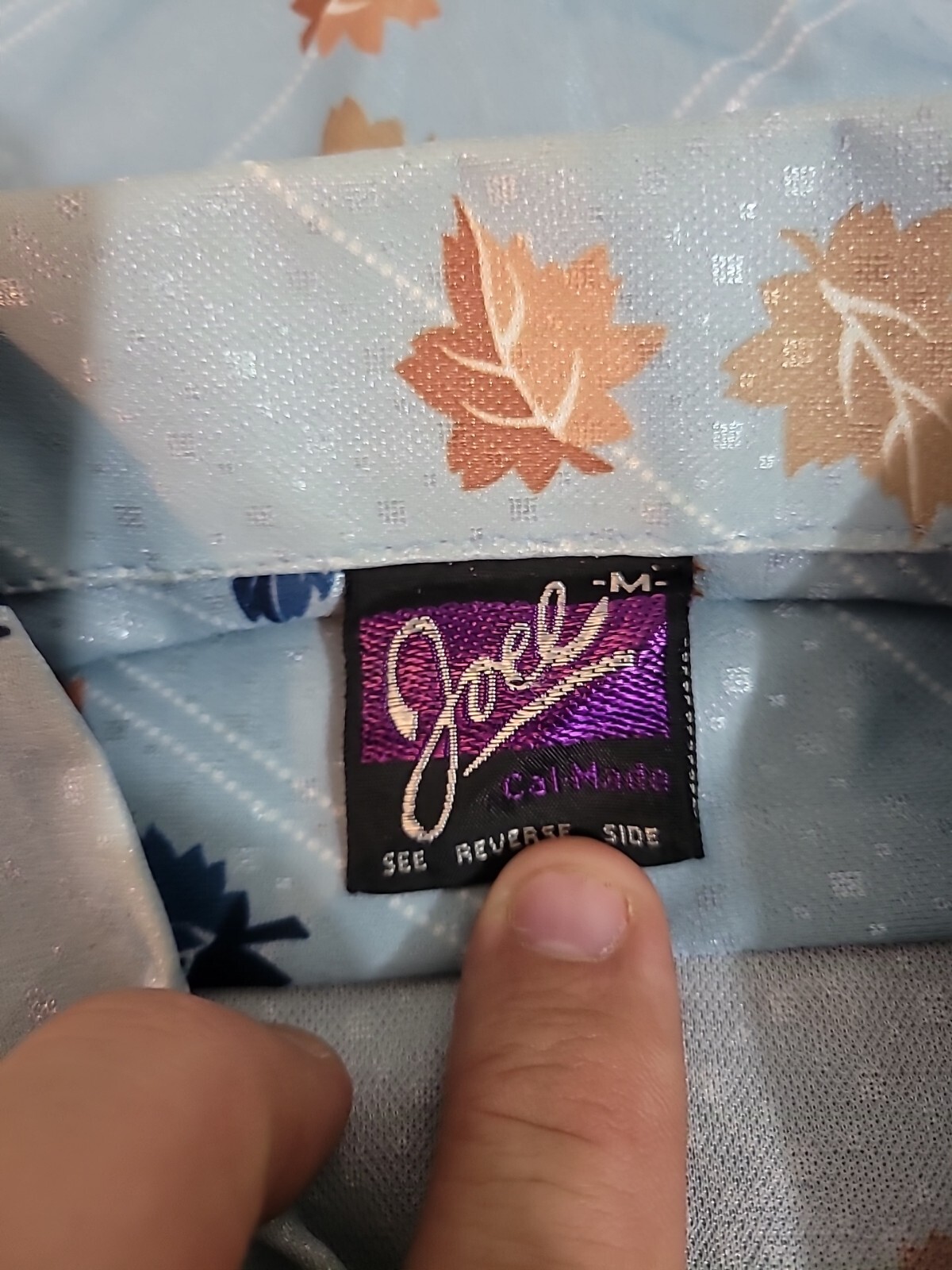 Vintage 70s Joel Cal-Made Polyester Disco Hippie Shirt Blue Leaves Men's Med M